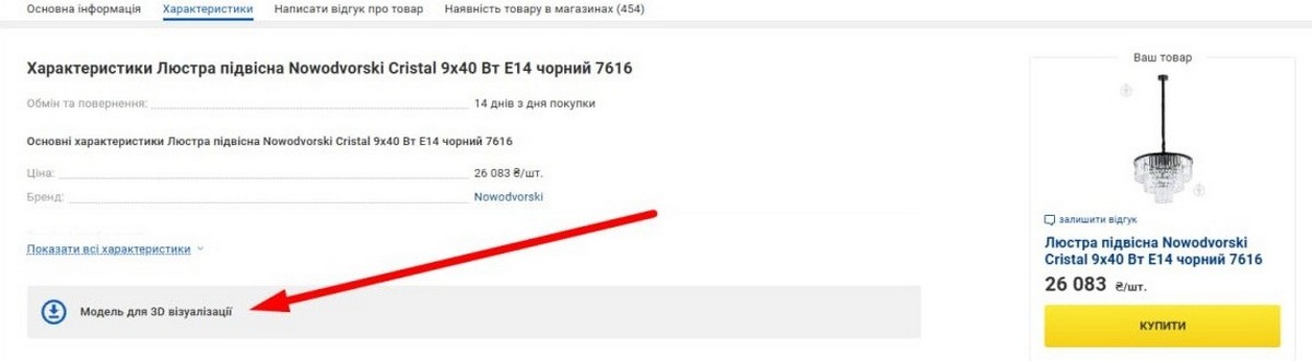 Також в картках деяких товарів на сайті доступні файлові 3D моделі, які можна завантажити для подальшого використання і створення максимально релевантних дизайн-проєктів та візуалізацій. Приклад: