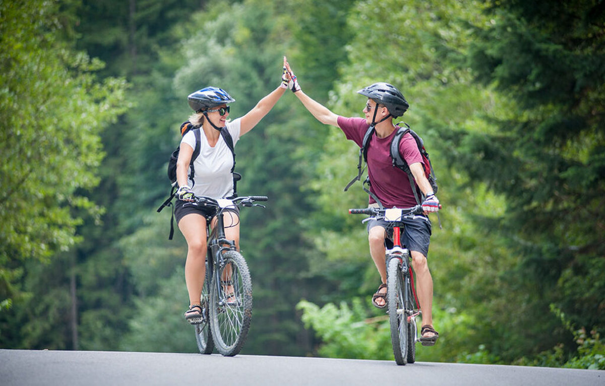 happy couple goes on a mountain asphalt road in the woods on bikes with helmets giving each other a high five
