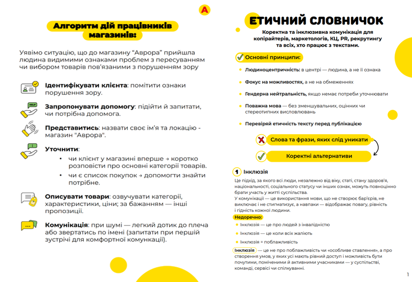 В інших ситуаціях покупцям може знадобитись допомога із супроводом торговим залом. У таких випадках співробітники мають розуміти, як коректно діяти та комунікувати, володіти відповідними навичками взаємодії й підтримки. Для тих, хто хоче поглибити свої знання за цим напрямком, проводять окремі тренінги з інклюзивної комунікації, формування інклюзивного погляду та подолання упереджень.