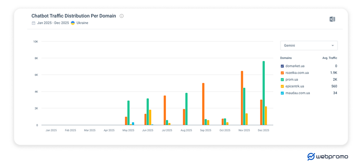 Gemini показує найбільш непередбачувану динаміку. У грудні 2025 року був зафіксований єдиний випадок, коли Prom.ua зміг випередити Rozetka за кількістю переходів із цієї платформи, що вказує на сильні позиції Prom в екосистемі Google.