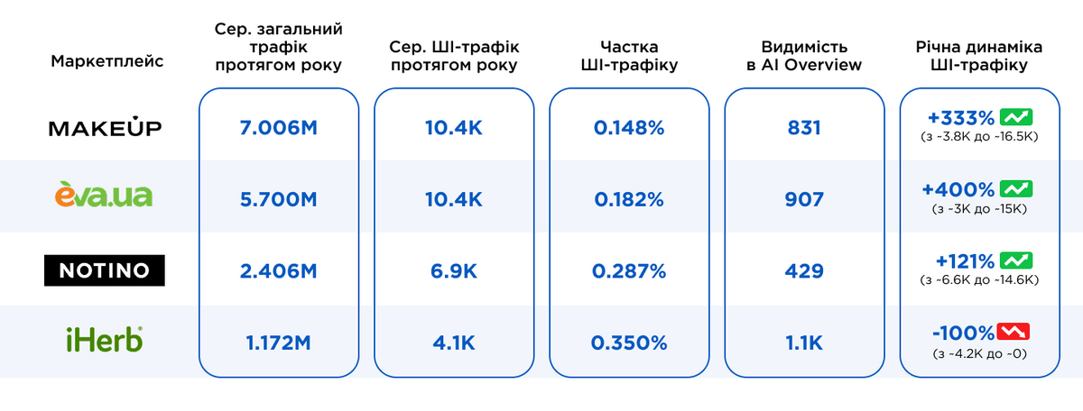 ANC.ua та Apteka911.ua демонструють найбільшу видимість у AI Overviews — 13 800 та 13 100 відповідно. Найвищу частку ШІ-трафіку в загальному обсязі має Liki24.com (0,619%), що дозволяє йому отримувати якісний трафік навіть при менших загальних охопленнях, ніж у Tabletki.ua.