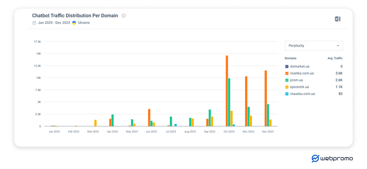 Rozetka впевнено випереджає інші маркетплейси за розміром ШІ-трафіка. При цьому ChatGPT забезпечує майже 93% усіх переходів із ШІ. Починаючи з квітня 2025 року майданчик почав стрімко зростати, збільшуючи відрив від Prom.ua.