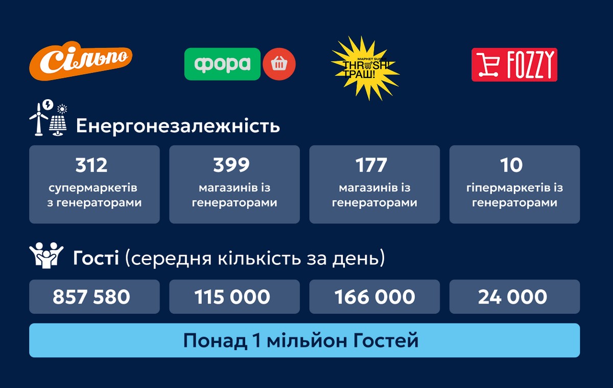 Більшість магазинів забезпечені резервним живленням. Крім того, у 156 супермаркетах Сільпо діють «Світальні» — зони, де можна зарядити пристрої, зігрітися, попрацювати або ж просто відпочити.