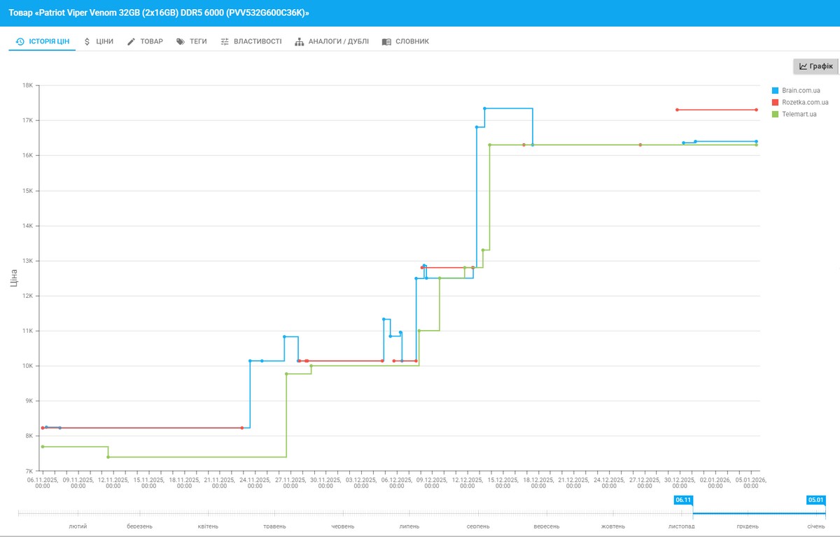 Найдраматичніший стрибок стався 12–15 грудня, коли за три дні ціна підскочила з 12 700 грн до 17 400 грн (+37% за три дні). Станом на початок січня 2026 року ціни стабілізувалися на рівні 16 300 – 17 300 грн.