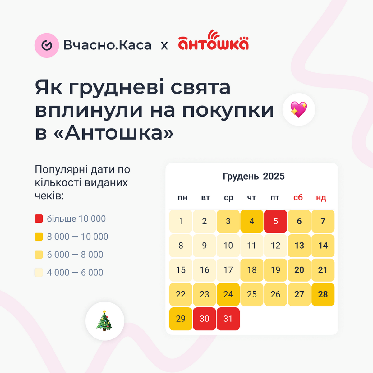 Аналітика у грудні підтверджує чітку прив’язку покупок до свят. Найпопулярніші дні у ритейлі цього місяця стали: