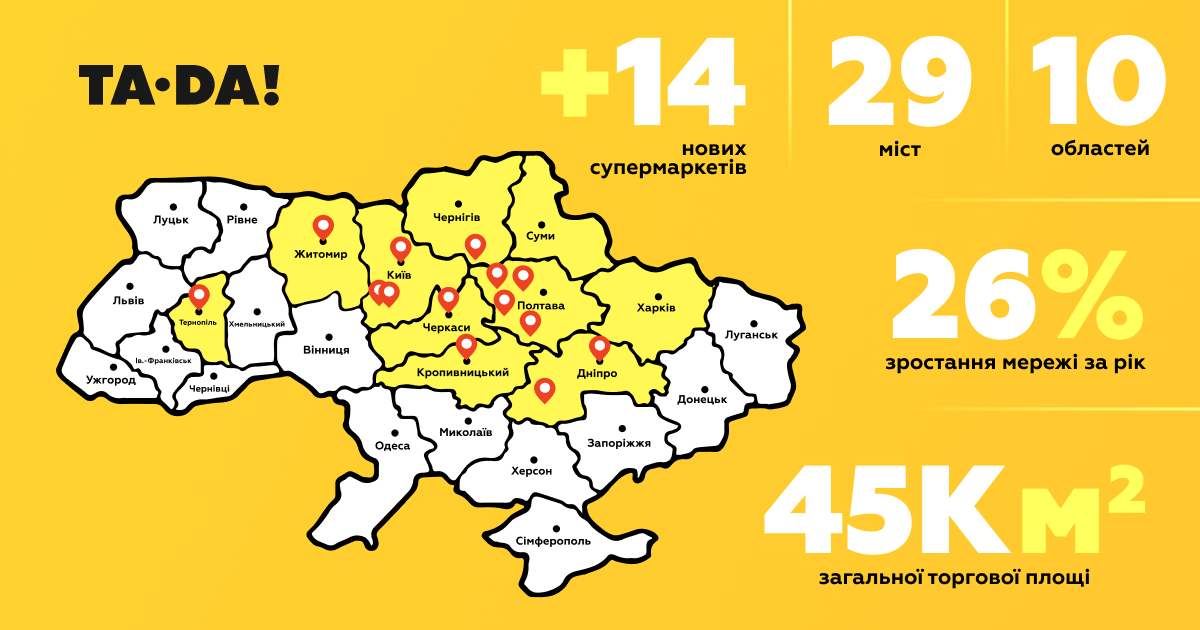 Впродовж 2025 року TA-DA! втілювала місію «Бути простором щастя для кожного» через активну експансію, відкривши 14 нових супермаркетів. Сьогодні мережа працює у 29 містах та 10 областях України, а вагомим кроком став вихід у нові регіони – Тернопіль і Білу Церкву. Як результат – загальна торгова площа мережі становить понад 45 000 кв. м., що на 19% перевищує показник 2024 року. По кількості торгових об’єктів мережа зросла на 26%, і станом на кінець 2025 року налічує 67 супермаркетів.