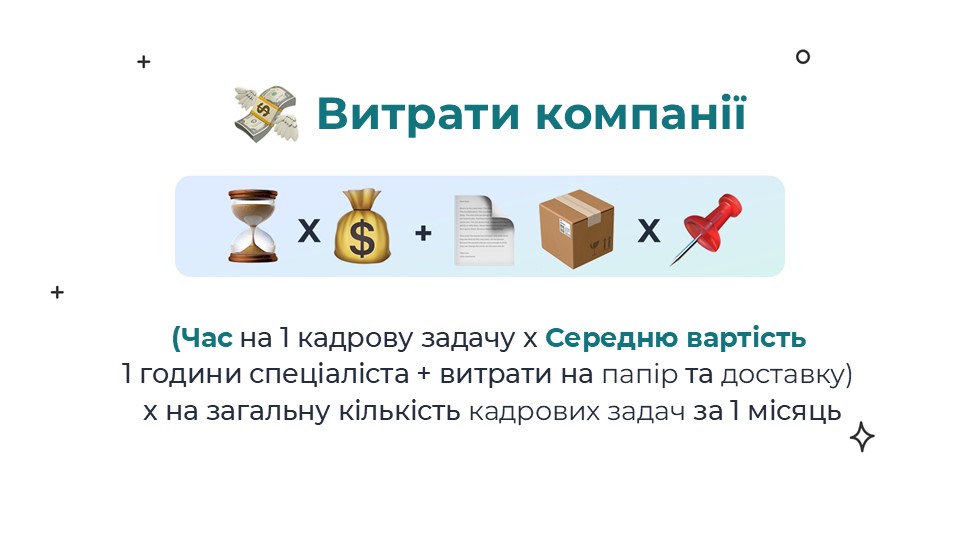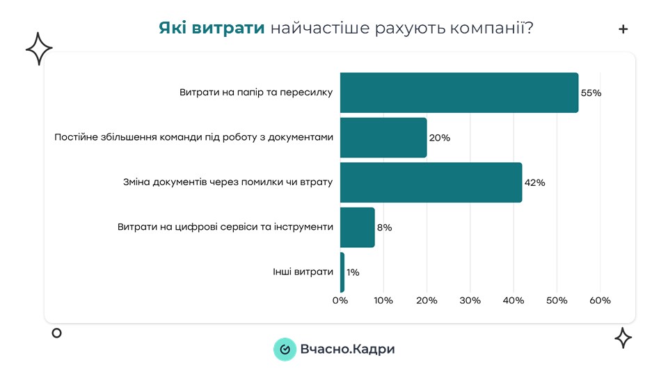 Найчастіше бізнеси рахують витрати на папір, пересилку документів та зміна документів через помилки та втрати. Це левова частина витрат на кадрові процеси в компанії. Але окрім цих підрахунків, як з’ясувалося в ході опитування, лише 13% компаній чітко розуміють свої реальні витрати на кадрові процеси.