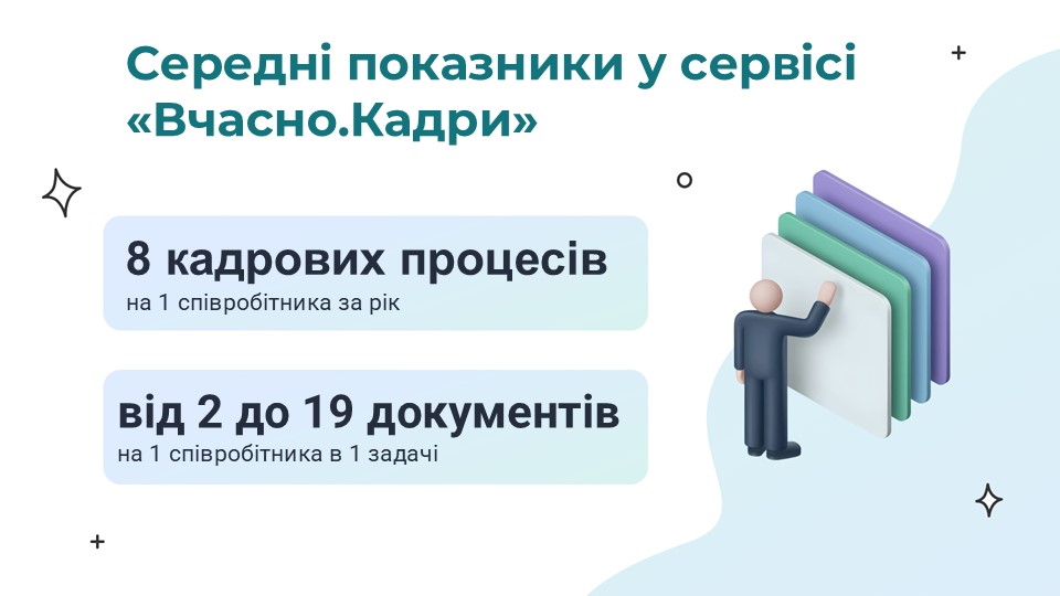 Статистичні показники по клієнтах сервісу «Вчасно.Кадри» свідчать, що в середньому за рік на одного співробітника припадає близько восьми кадрових процесів. Сюди входять і видача довідок, оформлення відпустки, переведення тощо.