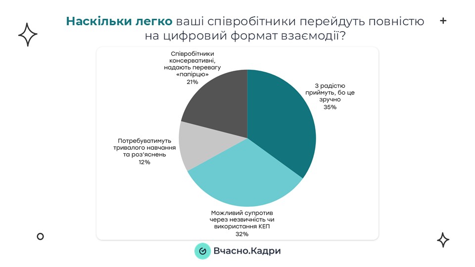 Проте важливим є й те, наскільки співробітники приймуть такі зміни. Бо є велика частина консервативної аудиторії, яку треба буде точно переконувати, що електронний документообіг так само надійний, як і паперовий. Таких, за даними опитування, приблизно 20%.