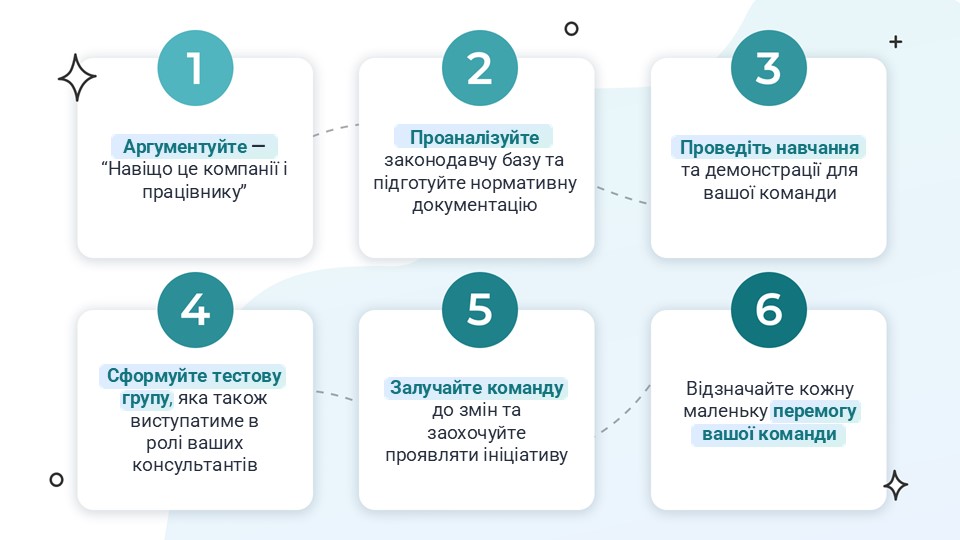 Водночас є й ті, для кого будуть певні труднощі з впровадженням. Тому, користуючись досвідом великих компаній, які вже цифровізували свої кадрові процеси, фахівці «Вчасно. Кадри» сформулювали шість кроків, яких варто дотримуватись.