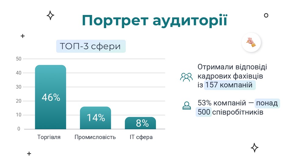 Спеціально до RAU HR Conference 2026 сервіс «Вчасно.Кадри» провів опитування серед 157 кадрових фахівців з різних компаній, що є клієнтами або партнерами сервісу. В основному обирали великий бізнес – більше половини опитаних компаній має в своєму штаті понад 500 співробітників – переважно зі сфери роздрібної та оптової торгівлі.