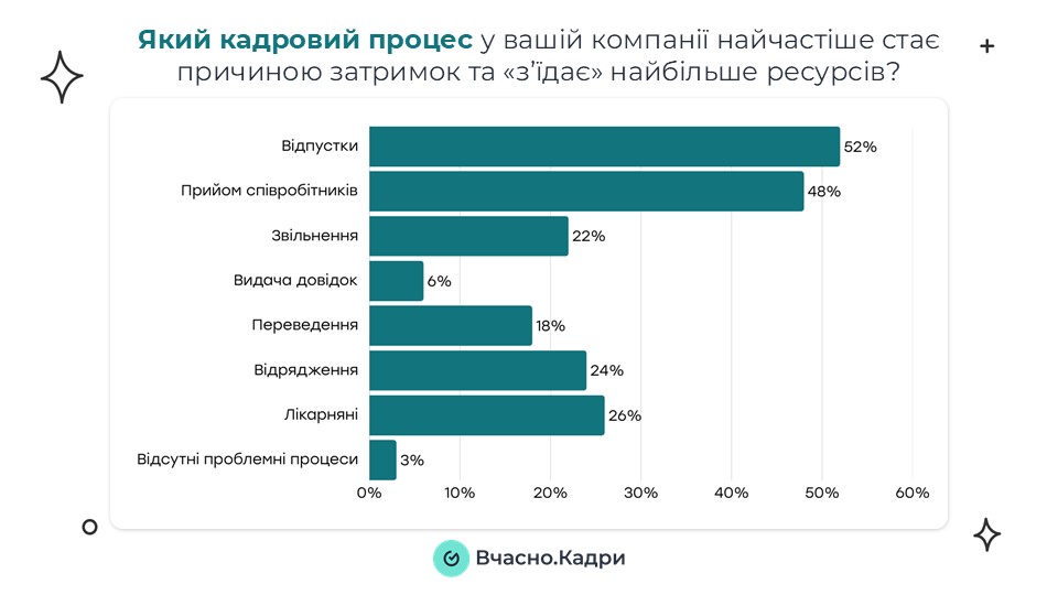 Перед тим, як прийняти рішення про цифровізацію, варто визначити, які HR-процеси є найбільш проблемними. Тут всі опитані були солідарними – це оформлення відпусток та процедура прийому на роботу нових співробітників.