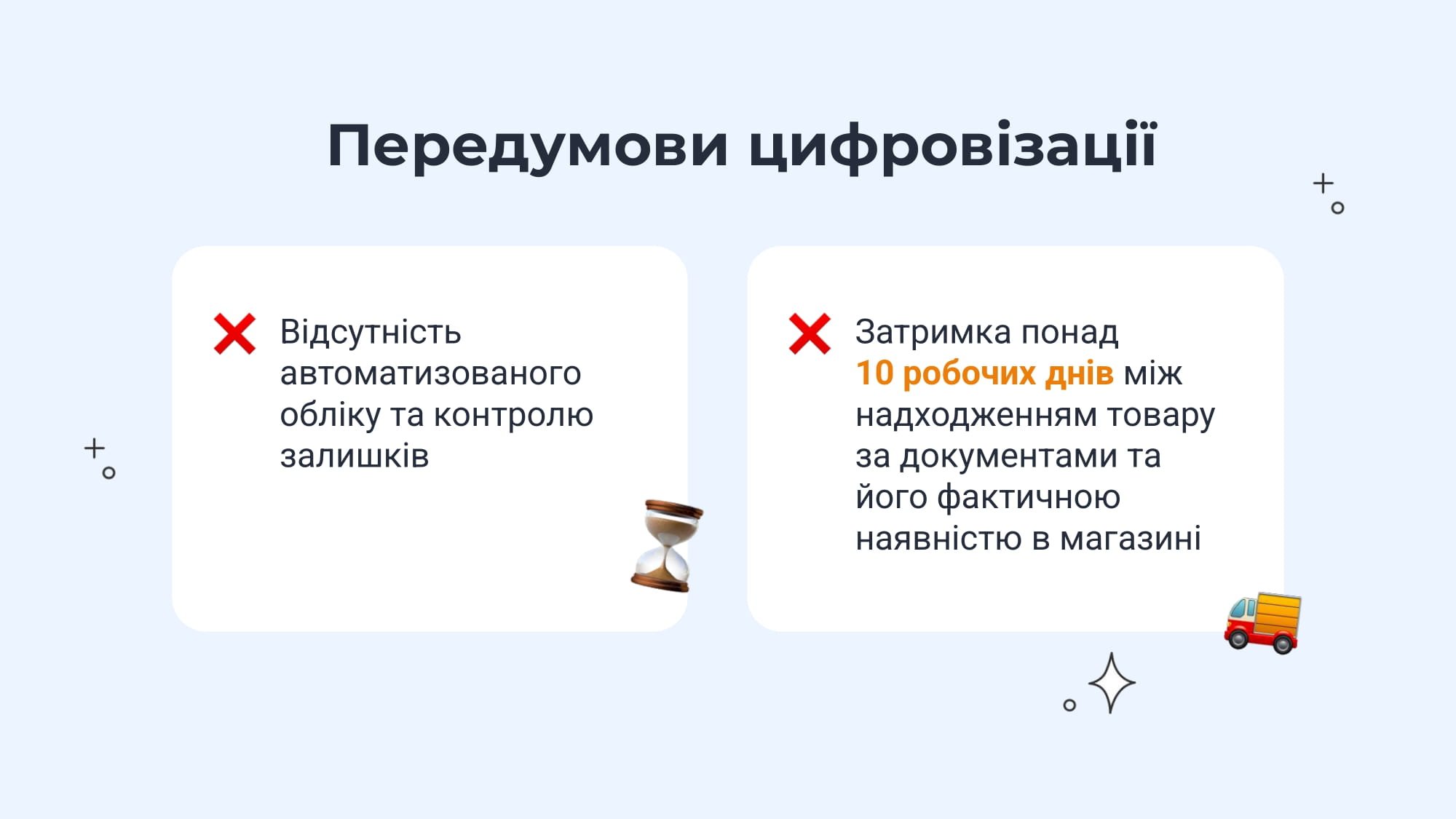 Неможливо було контролювати залишки та взяти під контроль замовлення. Тож компанія вирішила рухатися до цифровізації, у чому допомогли партнери – компанія Вчасно. Основна задача – взяти під контроль усі товарні запаси, які знаходяться на всіх локаціях.
