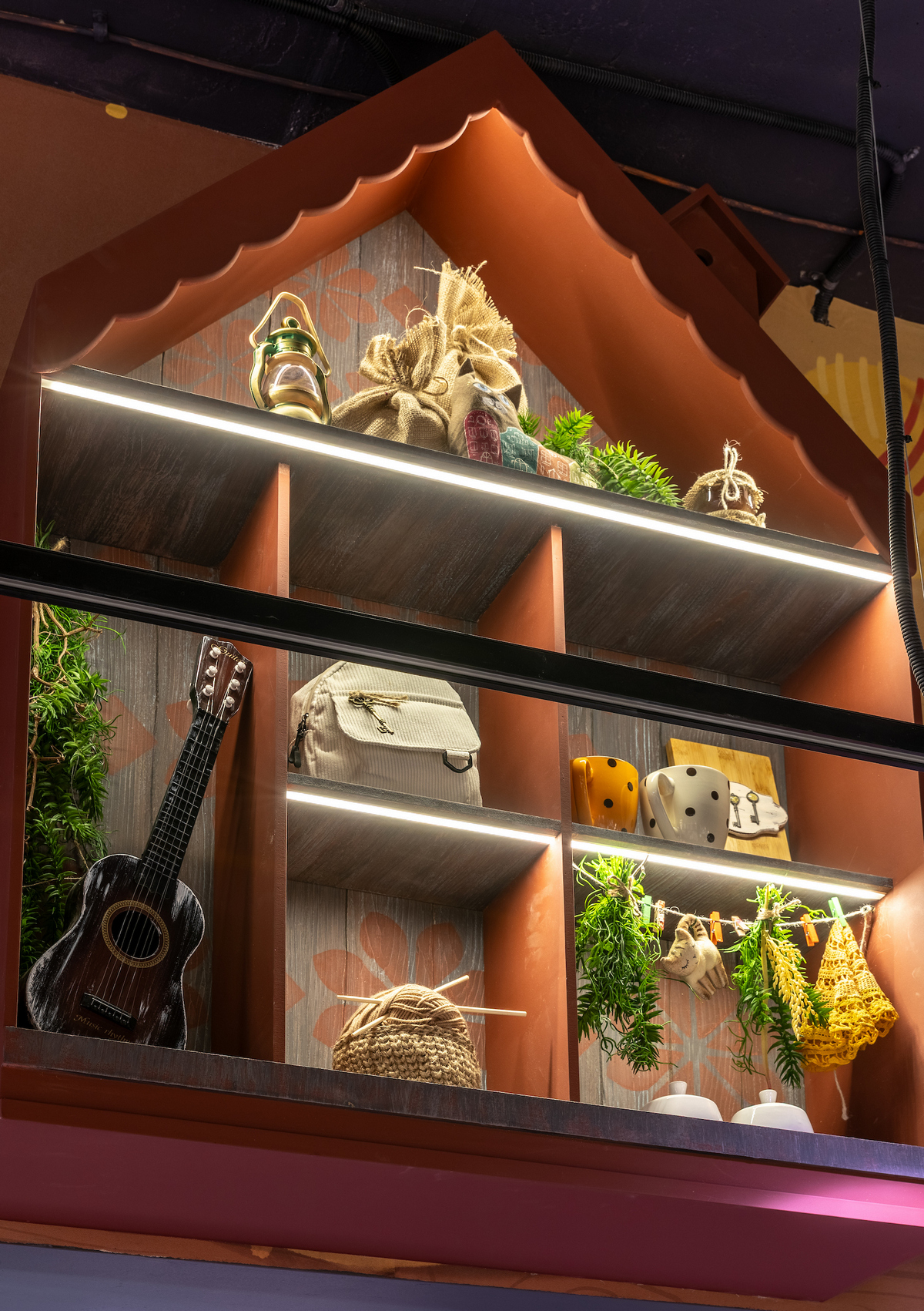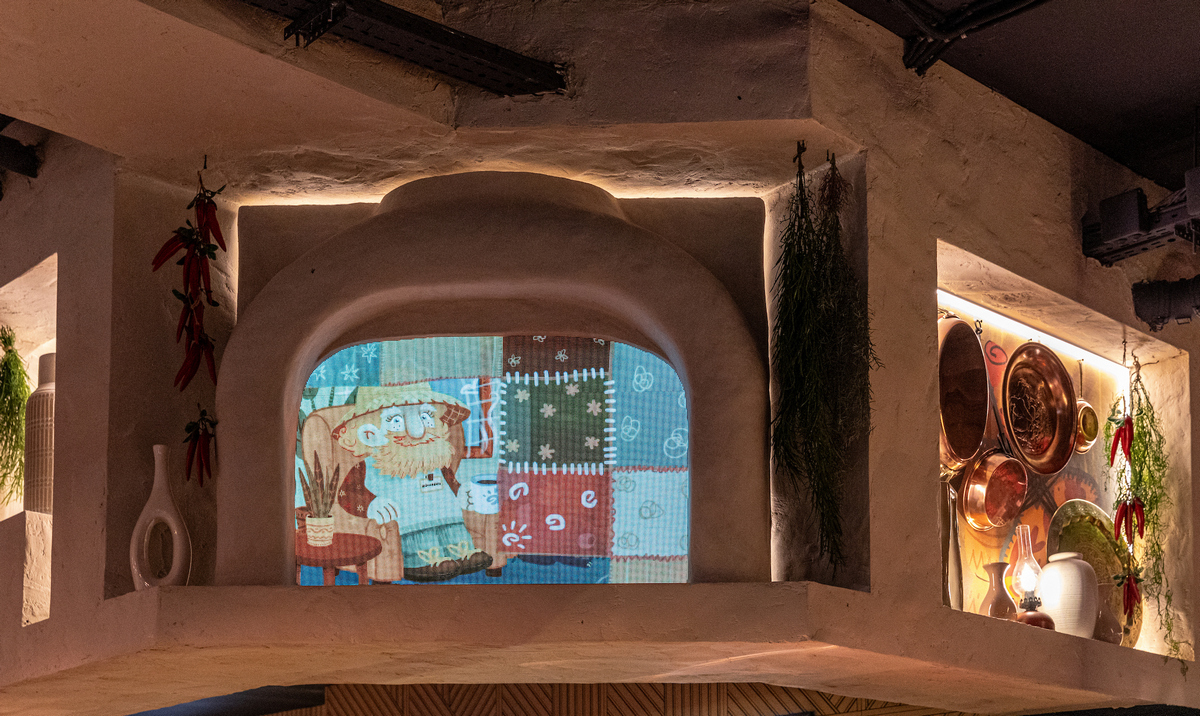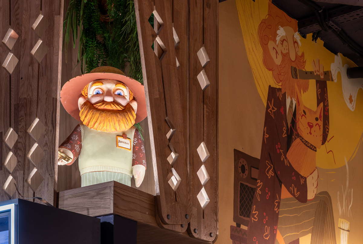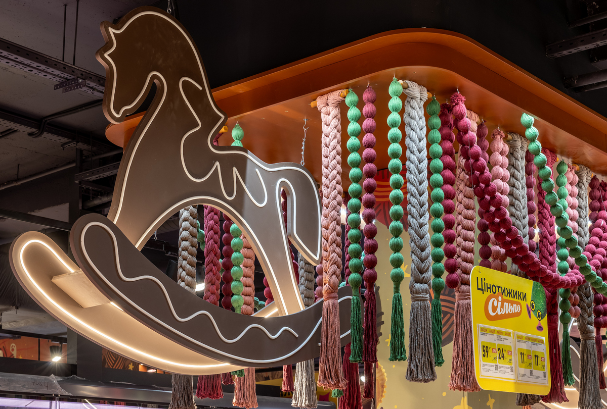 З порогу гості потрапляють у стилізовану під мазанку кухню: глиняний посуд, трави під стріхою, теплі кольори. Поруч — піч, всередині якої показують мультфільм про домовика. Через увесь магазин проходить червона нитка, яка обмотує колони й ніби об’єднує простір в одне ціле. У народі казали: якщо в домі щось зникло, це домовик бавиться. До речі, тут є й будиночок домовика із цими «знахідками». У ньому — ключі, чашки, етикетки та інші дрібні скарби, які могли загубити працівники чи гості.