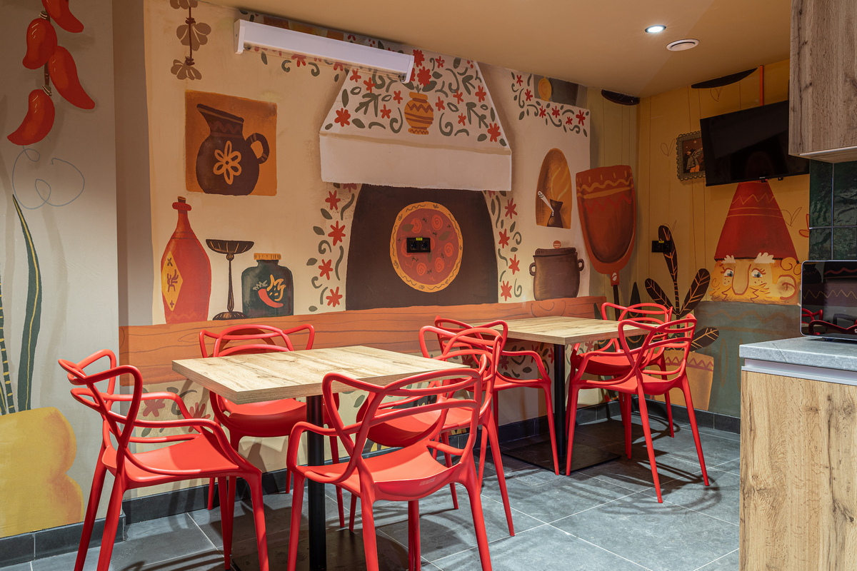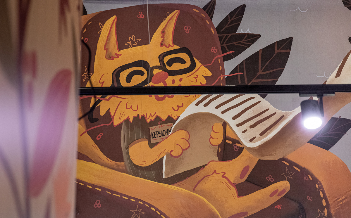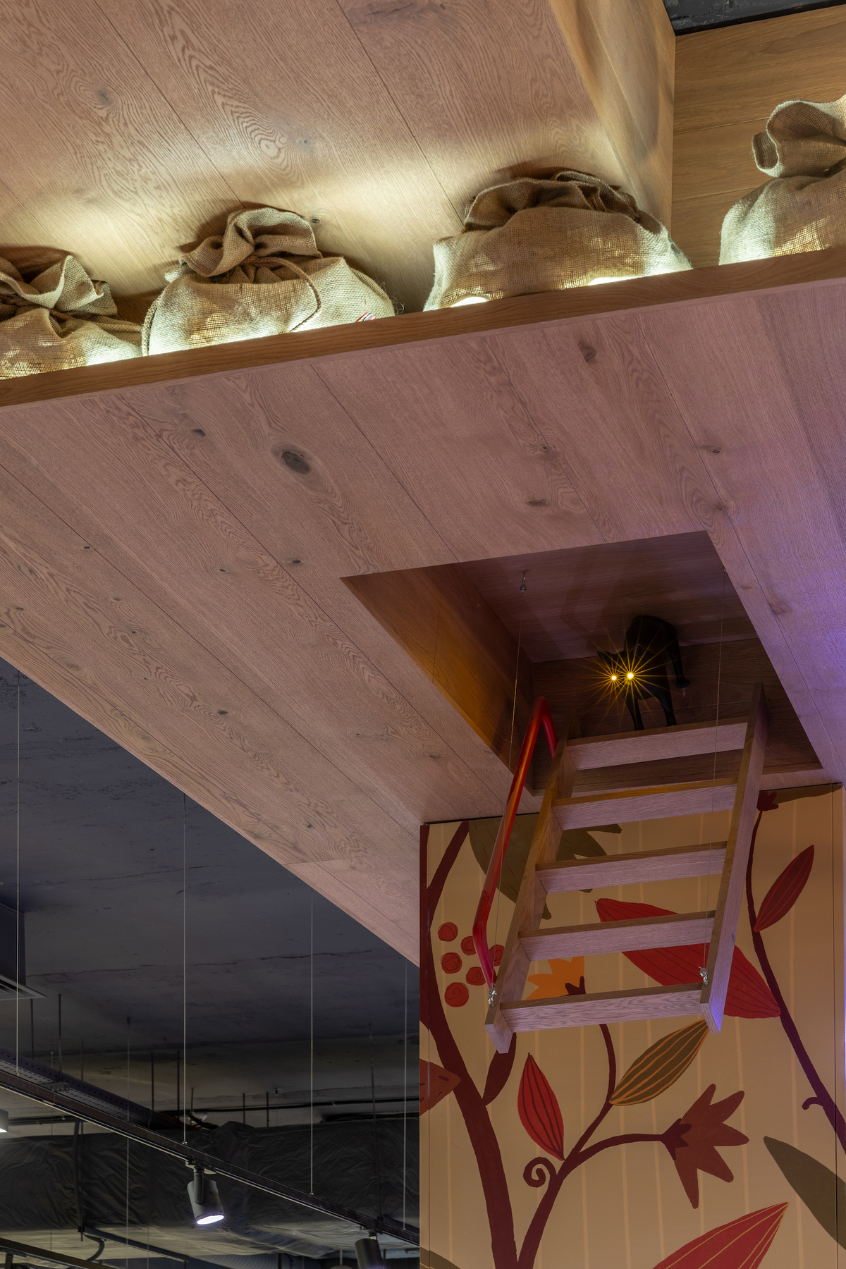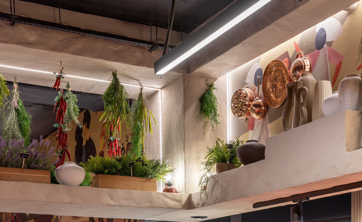 З порогу гості потрапляють у стилізовану під мазанку кухню: глиняний посуд, трави під стріхою, теплі кольори. Поруч — піч, всередині якої показують мультфільм про домовика. Через увесь магазин проходить червона нитка, яка обмотує колони й ніби об’єднує простір в одне ціле. У народі казали: якщо в домі щось зникло, це домовик бавиться. До речі, тут є й будиночок домовика із цими «знахідками». У ньому — ключі, чашки, етикетки та інші дрібні скарби, які могли загубити працівники чи гості.