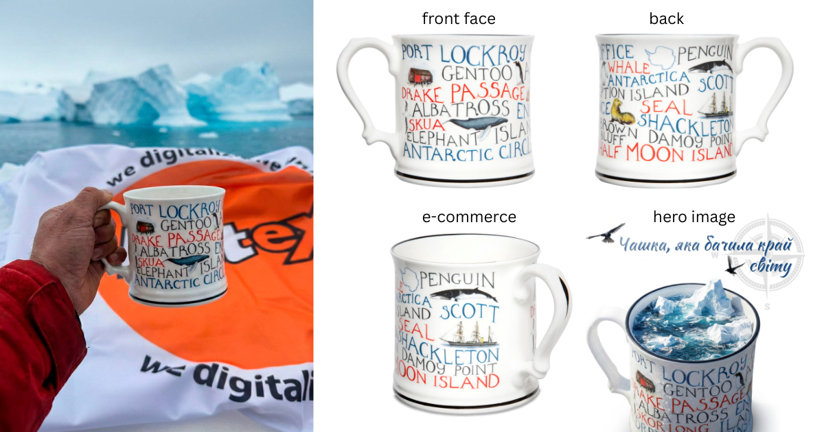 У межах проєкту як приклад було обрано сувенірну чашку, яка в даному кейсі розглядається не як сувенір, а як типовий SKU. Кілька кадрів, зроблені в Антарктиді, стали основою для створення повноцінного пакета візуального контенту, придатного для подальшого використання в цифрових каналах.
