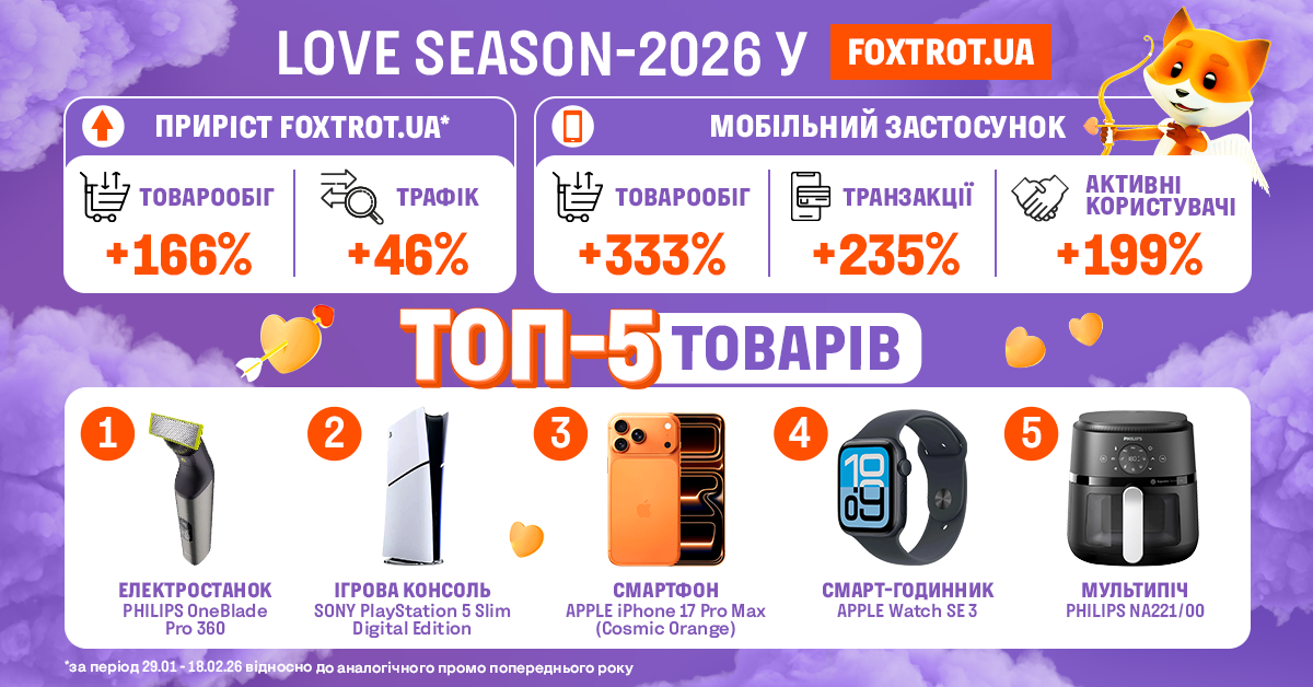 «Love Season 2026 став для Фокстрот справжнім випробуванням і водночас відзнакою високих результатів. Стратегія розвитку через мобільні канали та інтеграція нових технологій, таких як гейміфікація, дозволила не лише збільшити товарообіг, а й значно поліпшити взаємодію з клієнтами. Це свідчить про те, що Фокстрот задає тренди у сфері електронної комерції та покупок через мобільні платформи», - підсумував Юрій Поліщук, СЕО Фокстрот.