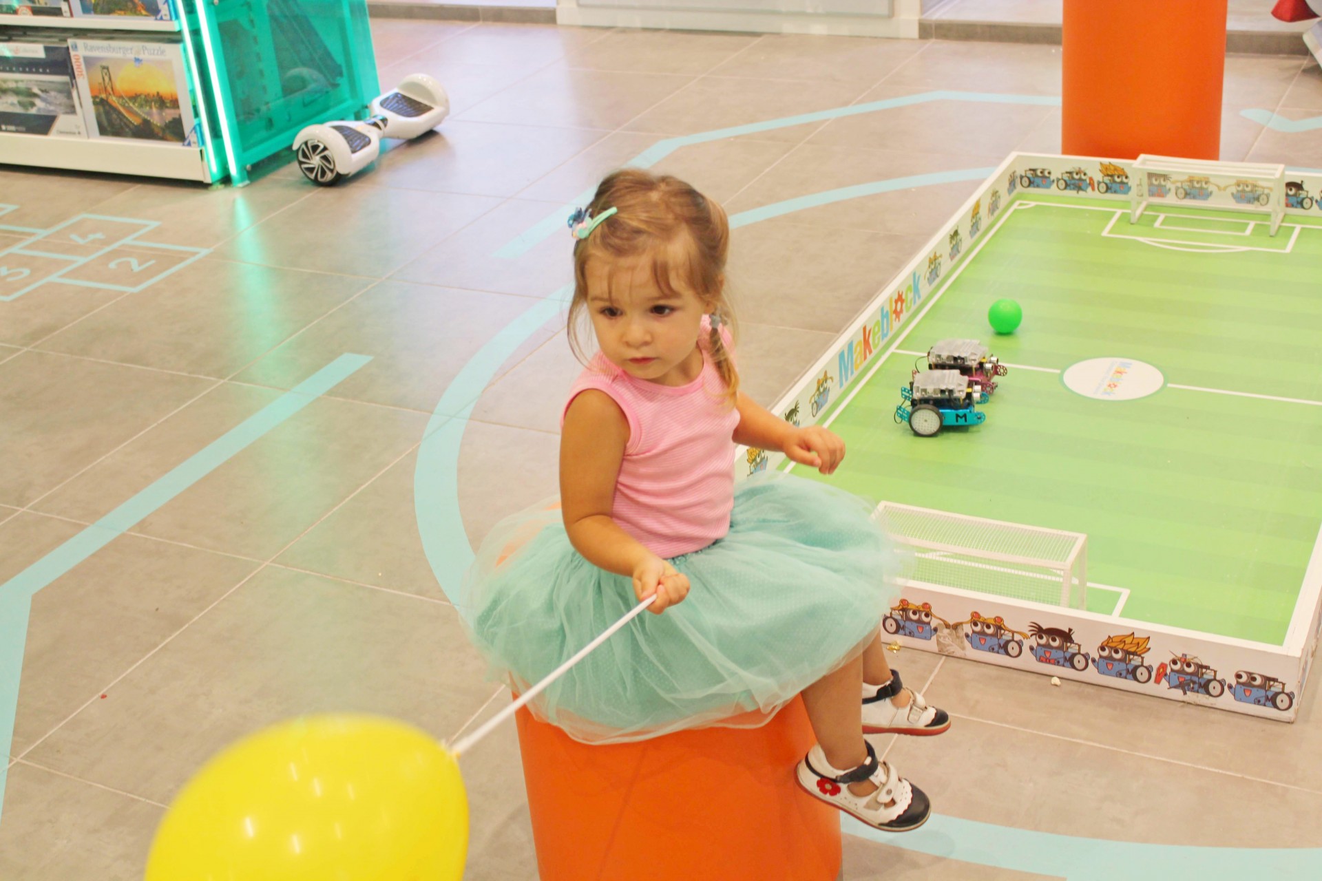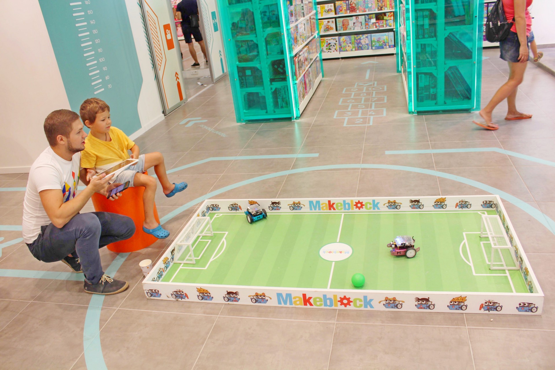 По ту сторону “телепорту”, поруч з книжковою полицею (куди ж без книг!), можна знайти цікаві IT-іграшки. Наприклад, за допомогою пультів управління можна пограти роботами у футбол.