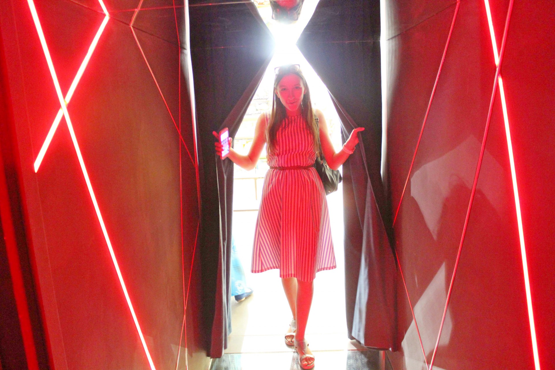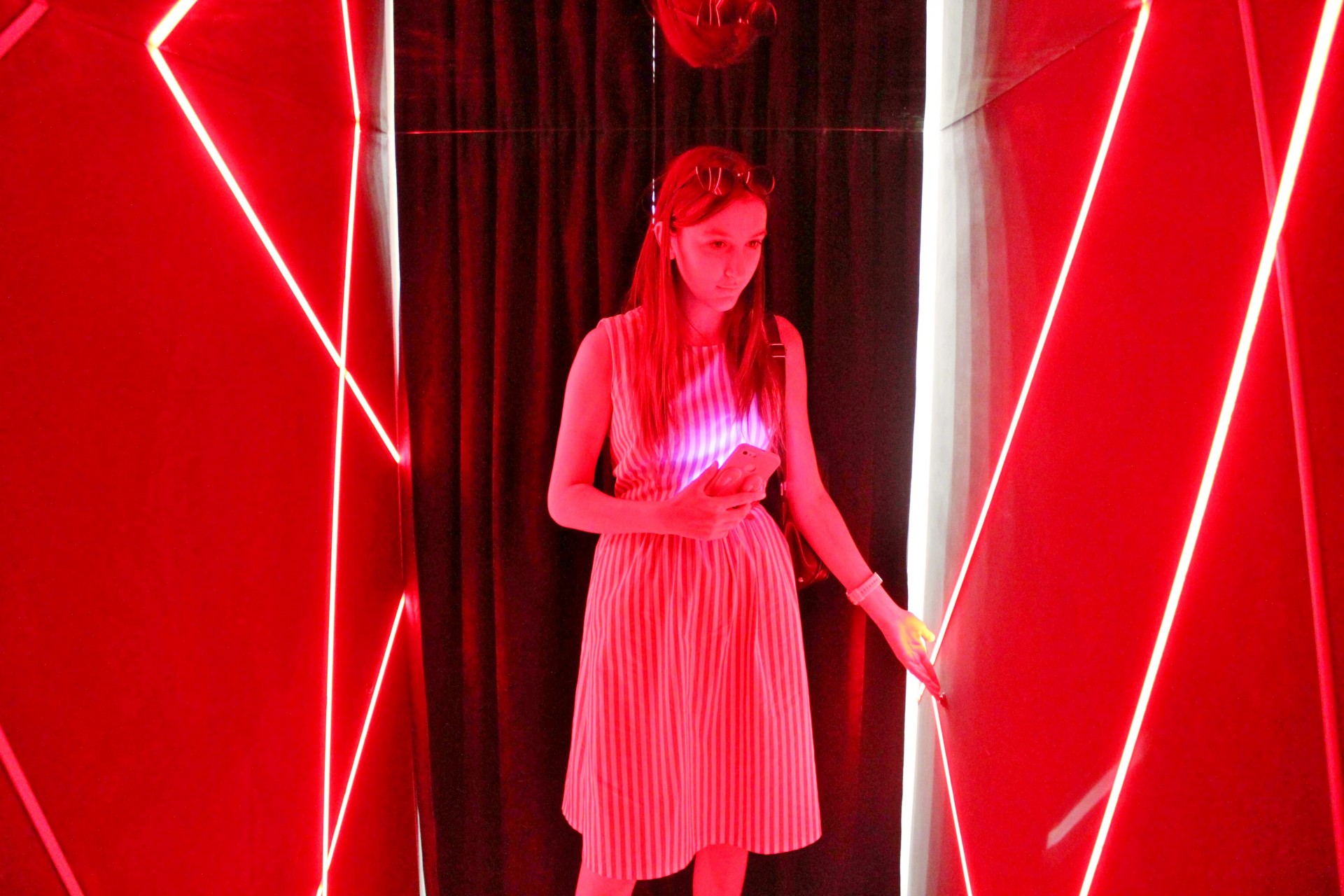 Ще одна «ізюминка» MYplay – лазерний тунель. Потрапляючи в нього, немов опиняєшся між двома футуристичними вимірами. В кількох місцях на стінах розміщені детектори, які запалюють червоні діодні лампи. Ефект підсилює дзеркальна стеля, висота якоЇ всього 1,8 м. Від несподіванки на якусь мить може перехопити подих, що ще раз нагадує про емоційного наповнення магазину, про яке RAU розповідала Світлана Святченко.