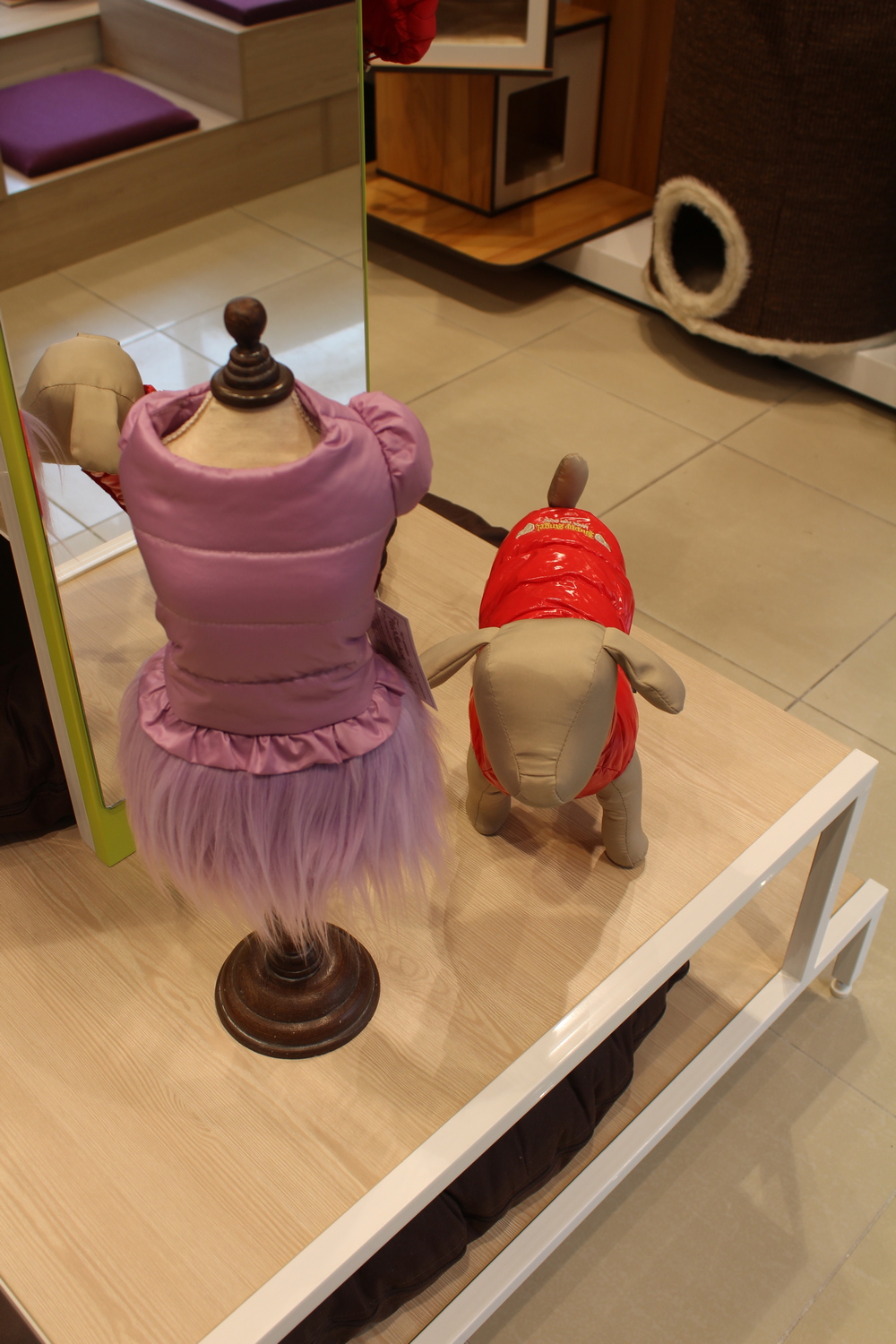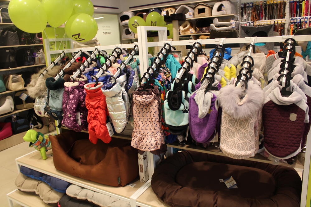 Поруч представлені численні курточки та комбинезончики для кімнатних собак, які не звикли до суворих київським зим. Господарям є з чого вибирати наряди для чотириногих модниць.