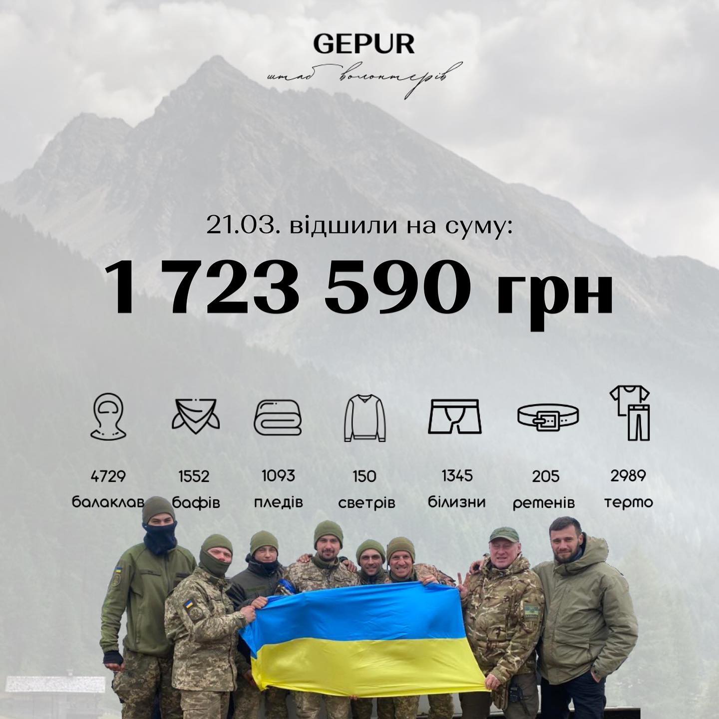 Бренд дизайнерського жіночого одягу Gepur переорієнтувався на виробництво теплого одягу, термобілизни, балаклав, бафів та пледів для Збройних сил України, Національної гвардії, підрозділів Територіальної оборони та Національної поліції. Станом на 21 березня, Gepur пошив такого екіпірування на 1,7 млн гривень, зокрема 4729 балаклав, 1552 бафів, 1093 пледів, 150 светрів, 1345 штук білизни, 205 ременів та 2989 штук термобілизни.