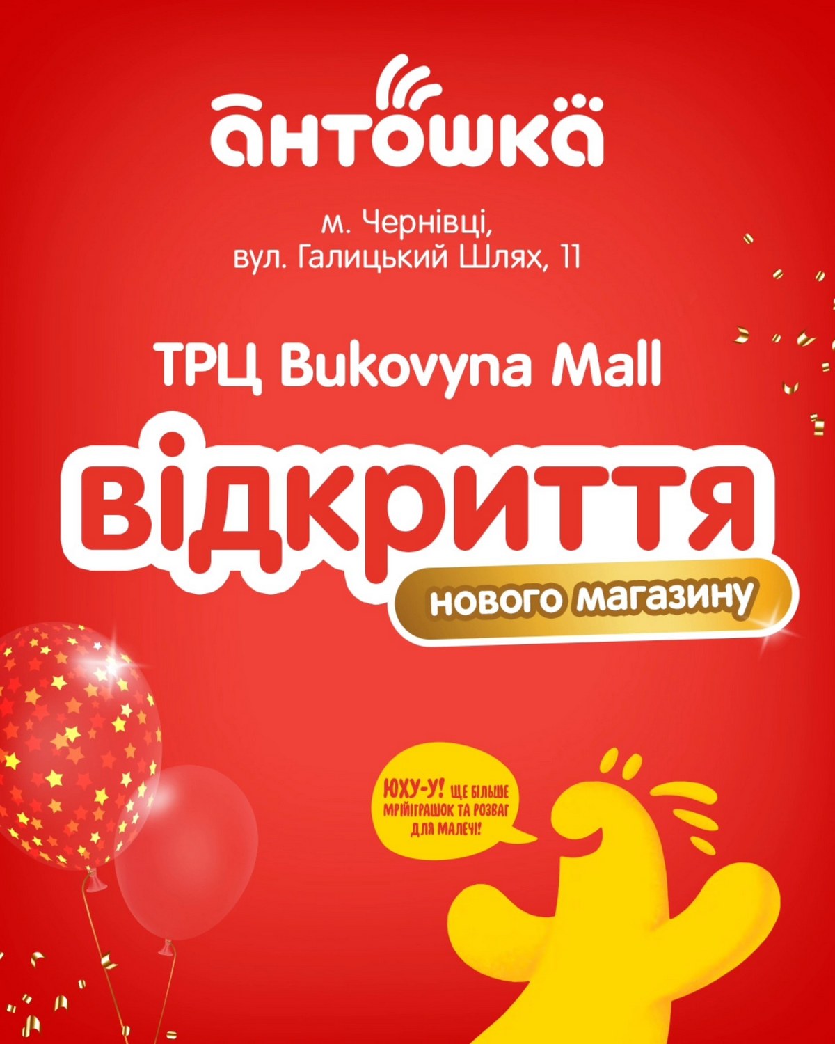 А 20 грудня у ТРЦ Bukovyna Mall, що в Чернівцях (вул. Галицький шлях, 11) відкрився ще один новий дитячий магазин Антошка. Він став другим у цьому місті. Наразі мережа налічує 41 магазин у 17 містах.