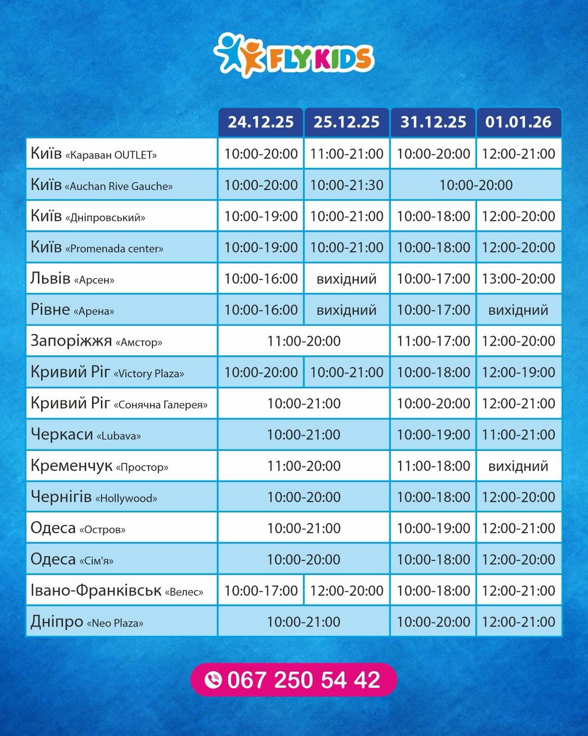 Мережа Fly Kids відкрила новий парк розваг у Черкасах - у ТРЦ Lubava. Святкова подія відбулася 5 грудня 2025 року. Новий парк вирізняється ще й оновленим дизайном, якого раніше не було в жодному з Fly Kids. Команда повністю переосмислила візуальну концепцію: простір став більш лаконічним, світлим і водночас трохи футуристичним за рахунок нових текстур, форм та освітлення. Відкриття черкаської локації стало частиною ювілейного року мережі, оскільки в 2025-му Fly Kids відзначив своє 10-річчя. Fly Kids у Черкасах створений так, щоб діти могли гратися безпечно та активно, а батьки — комфортно відпочивати поруч. Наразі працює 16 ДРЦ в 11 містах.