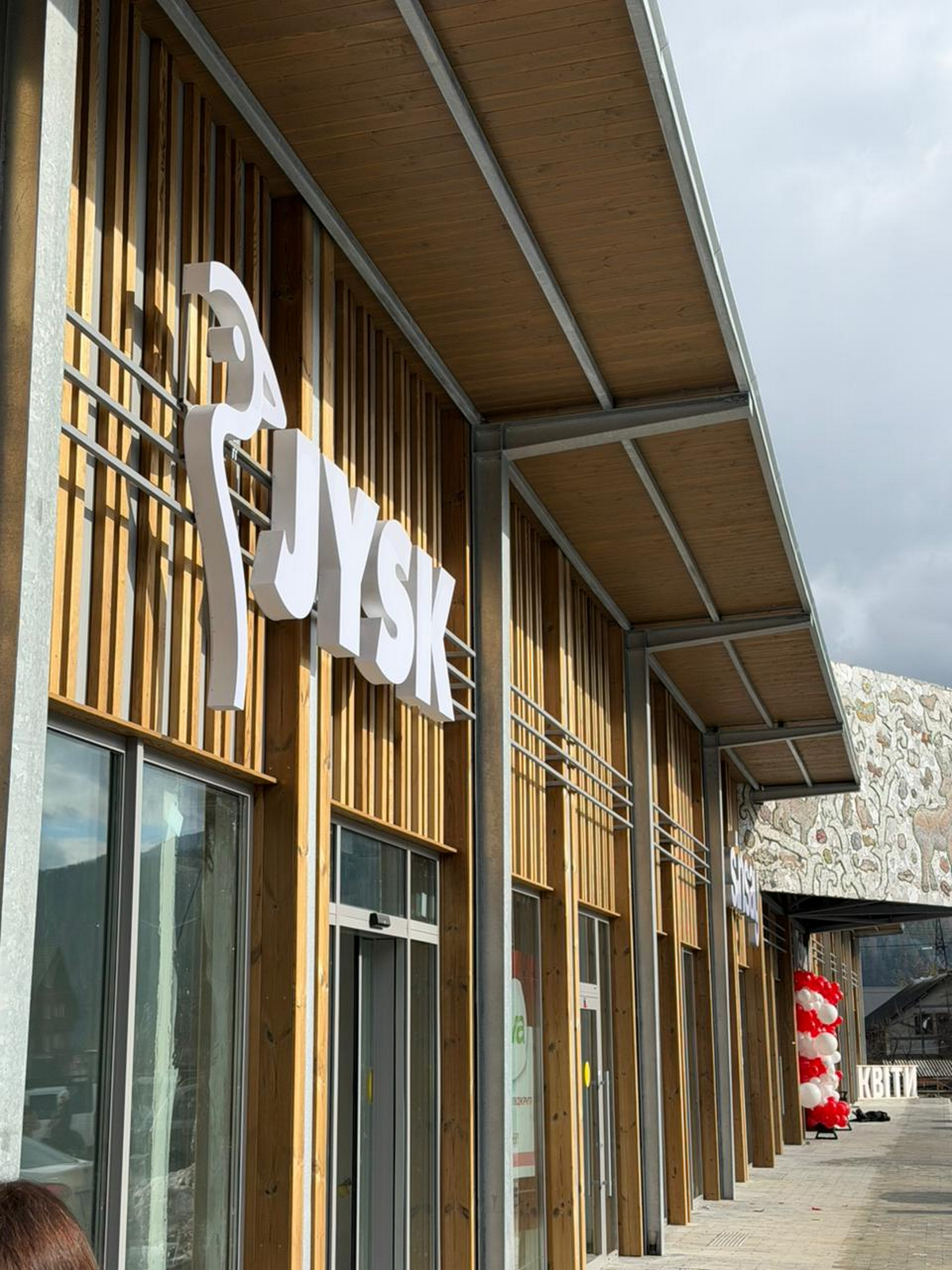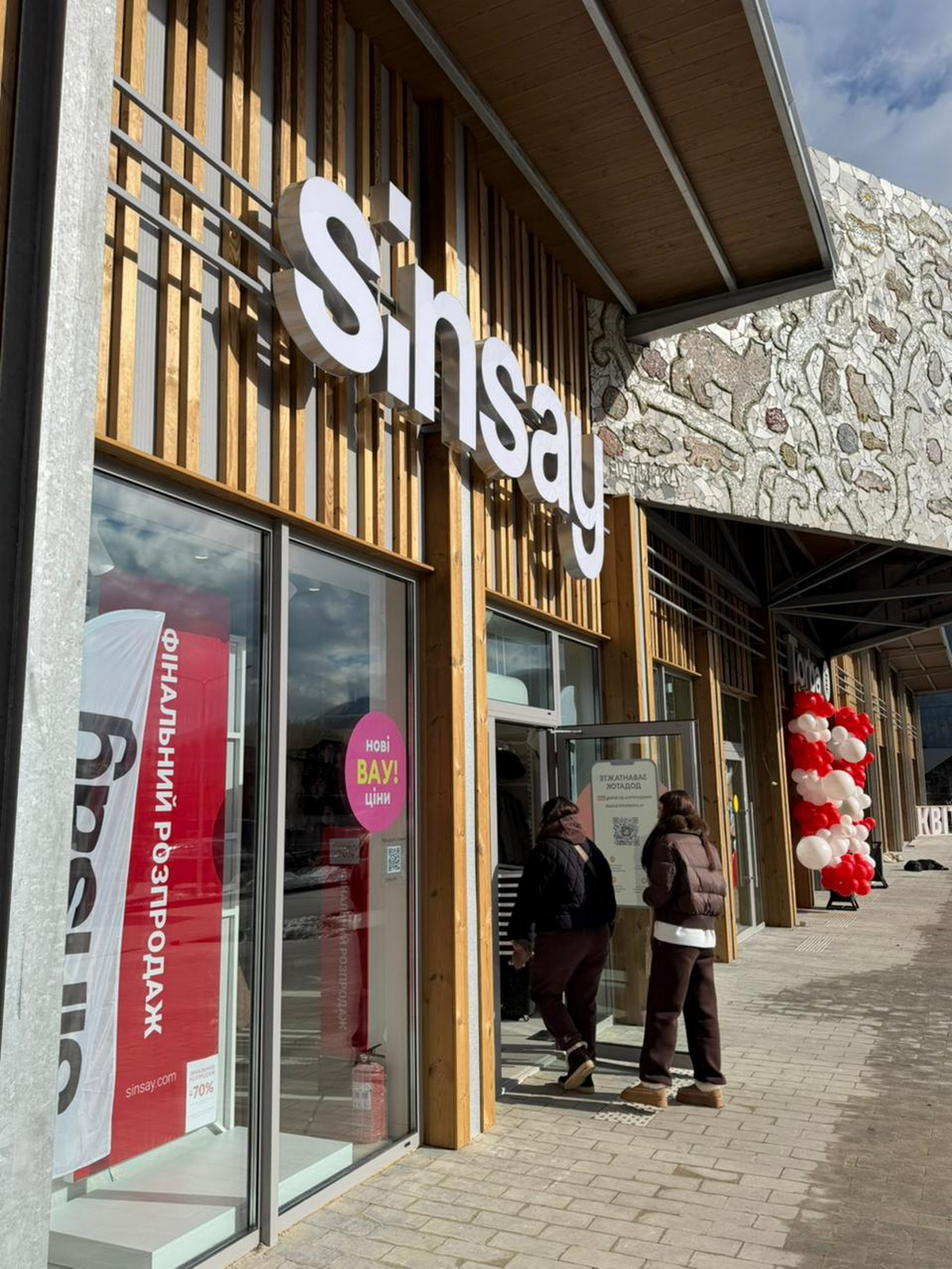 - Будівля оздоблена натуральним деревом і фальцем, оцинкованою сталлю, дуже стійким і довговічним матеріалом. Родзинкою нашого фасаду стала мозаїка, яку допомогло реалізувати мистецьке обʼєднання «Затирка».Також, ми дуже пишаємося тим, що ТЦ є інклюзивним – формат ритейл-парку дозволяє уникнути непотрібних сходинок, що робить входи доступними для маломобільних груп населення.
