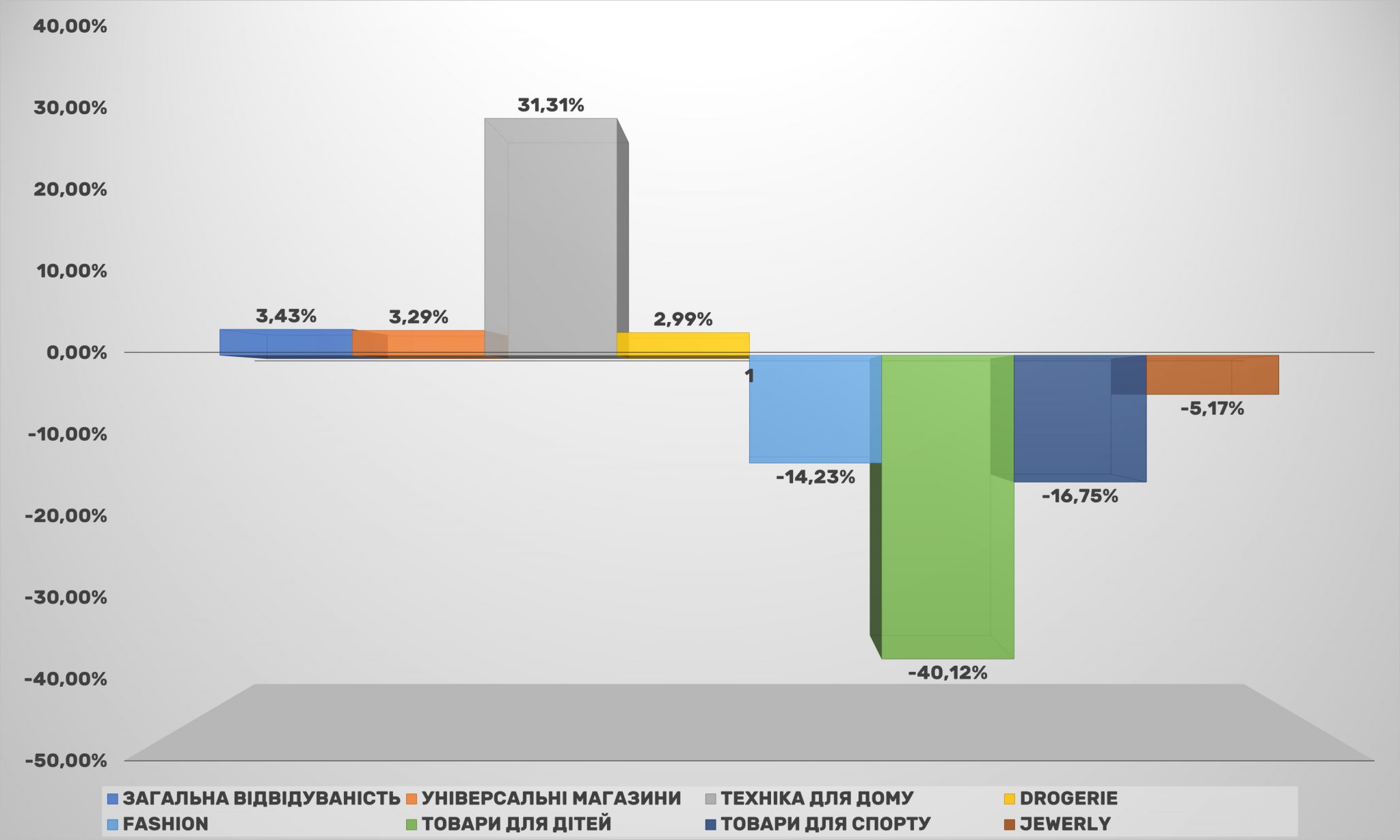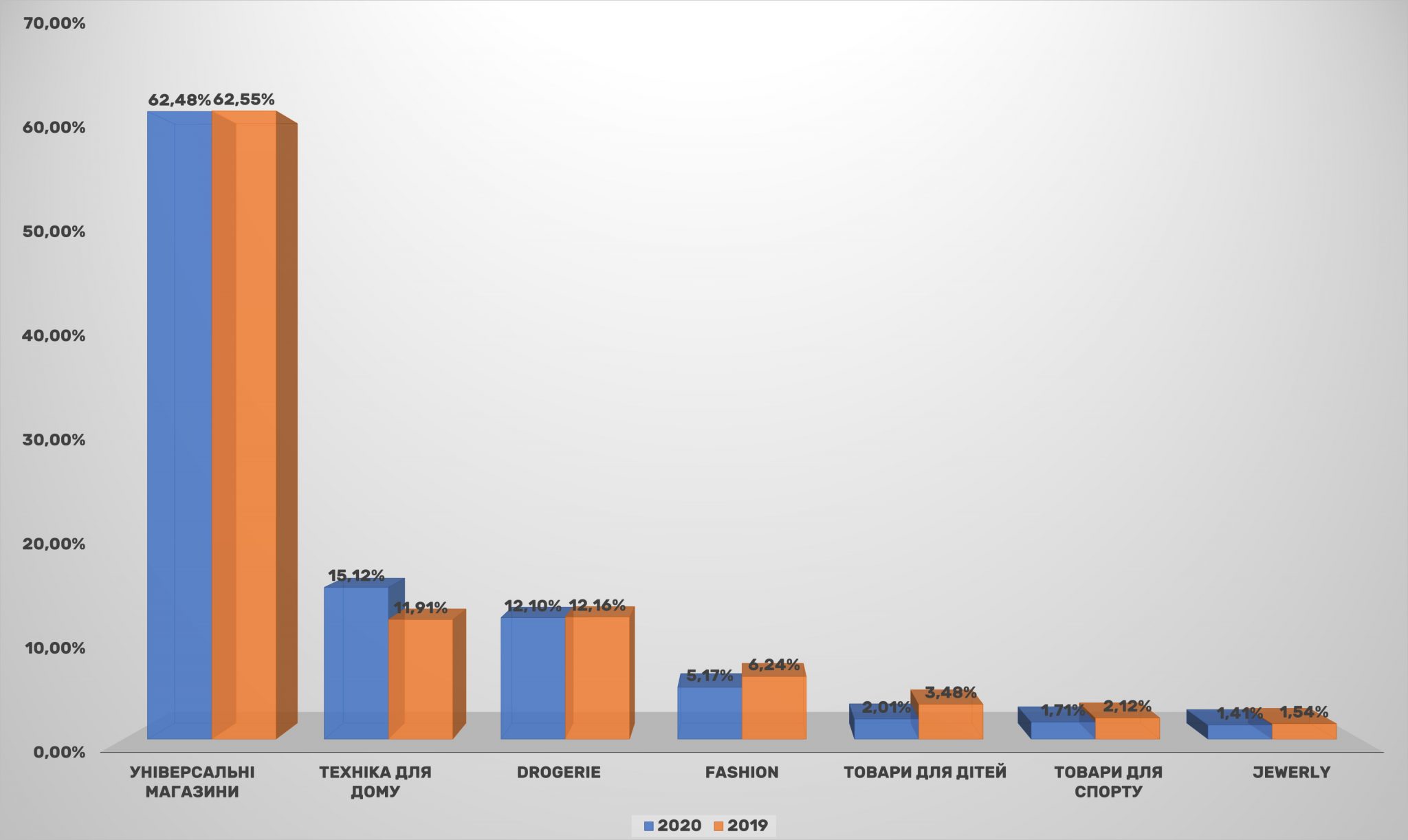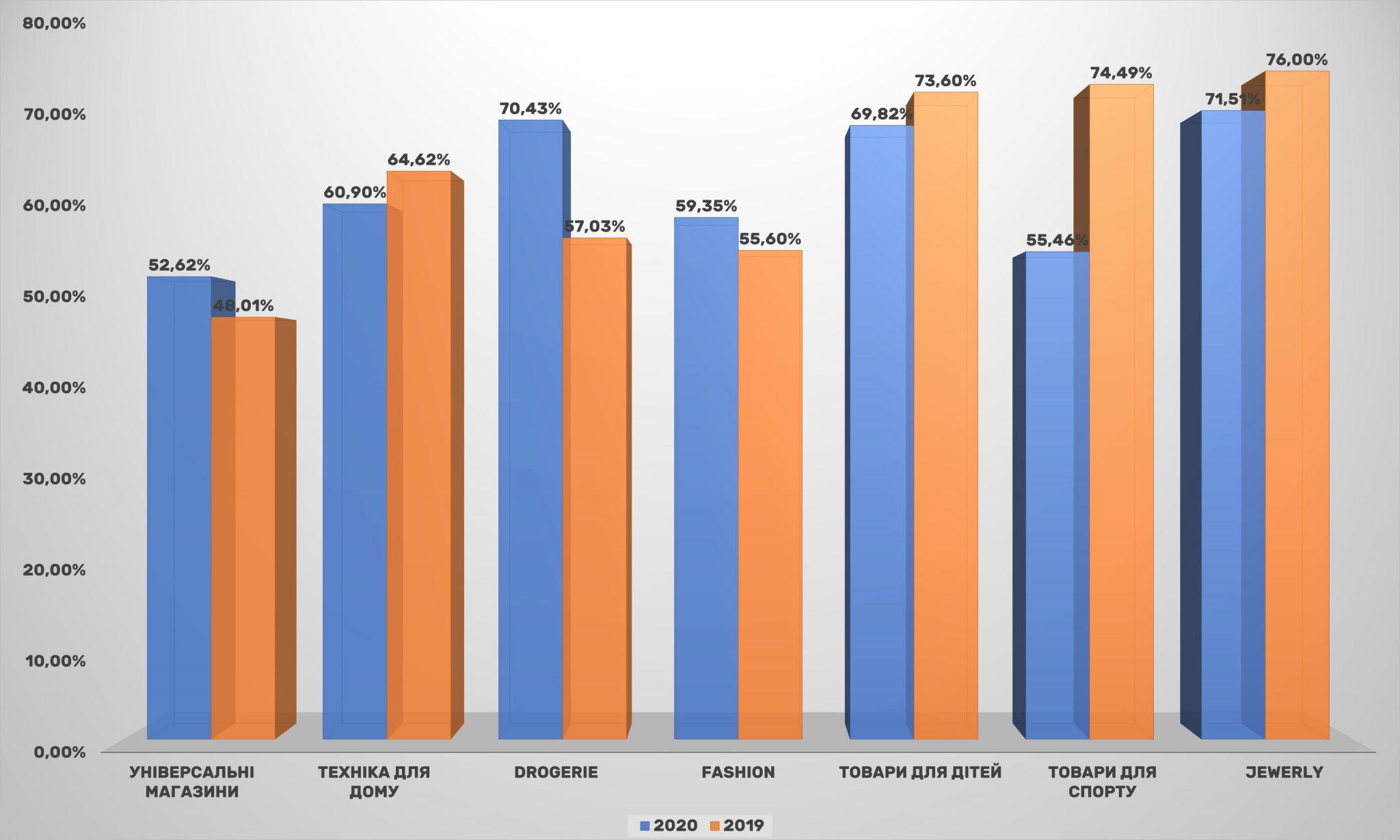 Решта категорій втратили в охопленні порівняно з 2019-м. Так, в абсолютних показниках найсильніше просів сегмент товарів для дітей (падіння більше 40%). За ним йдуть товари для спорту і категорія fashion. Якщо просідання fashion-рітейлерів ще можна пояснити скороченням покупок модниками, які стали рідше виходити з дому і змінювати вбрання, то товари для спорту, навпаки, за різними даними, користуються підвищеним попитом. Одне з пояснень може бути в тому, що цим двом напрямки електронної комерції вдалося домогтися високої конверсії, і падіння охоплення ніяк не відбивається на зростанні продажів.