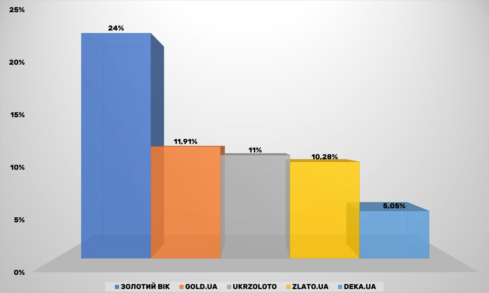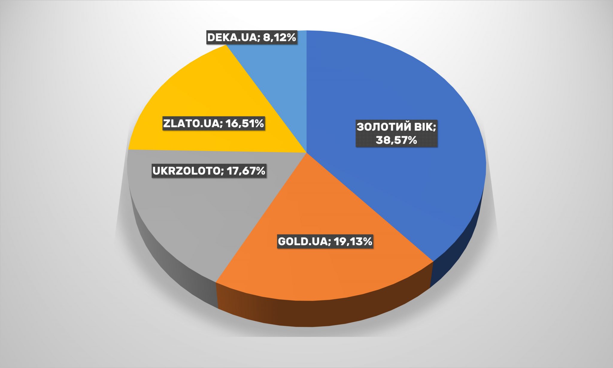 Тепер «велика трійка» ювелірних онлайн-рітейлерів України виглядає так: Золотий Вік, Gold.ua і Укрзолото. Сумарно вони охоплюють більше 75% аудиторії серед перших п’яти інтернет-магазинів прикрас та аксесуарів.