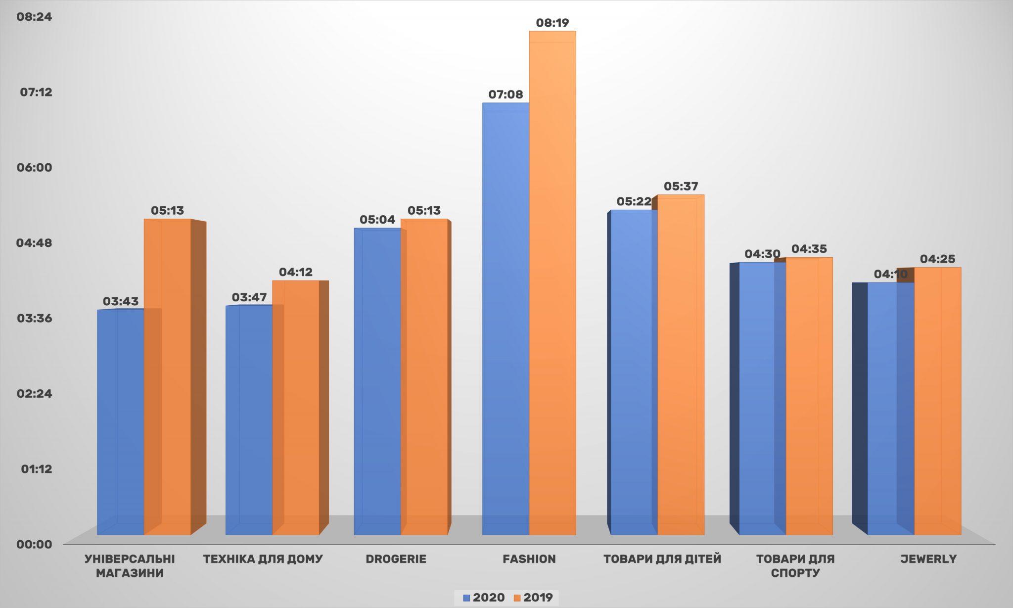 Цікаво, що лідери за охопленням аудиторії – універсальні магазини – знаходяться на останньому місці за часом перебування на сайті, всього 3 хвилини 43 секунди. Трохи довше відвідувачі знаходяться на сайтах рітейлерів з продажу техніки для дому.