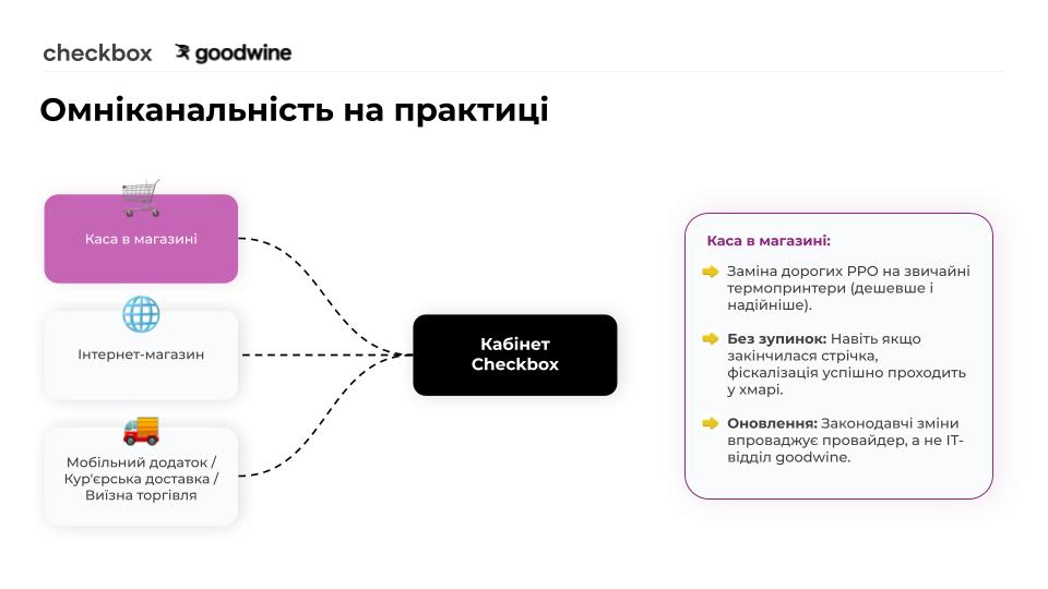 Зараз у нас працює омніканальне рішення: в усіх сферах, які вимагають фіскалізації – використовується ПРРО Checkbox. За рахунок цього ми можемо напрацьовувати експертність і робити додаткові фічі, які корисні зокрема відділу бухгалтерії.