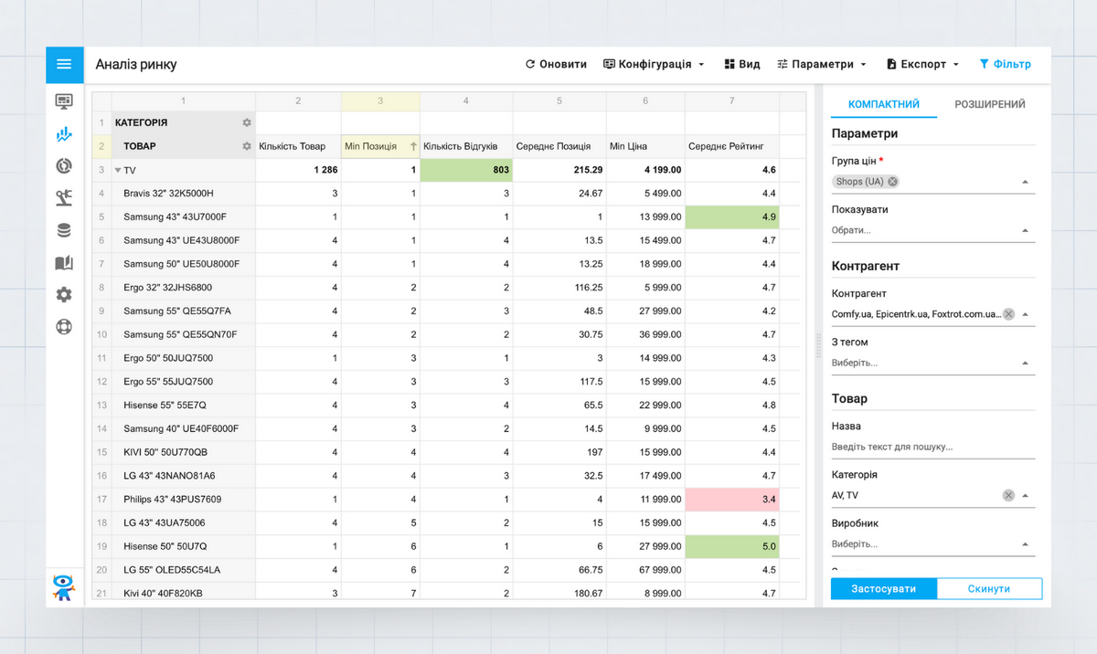 Ось який вигляд це має в інтерфейсі Pricer24. Для прикладу фахівці взяли категорію «TV» у Rozetka, Comfy, Foxtrot і Epicentrk.