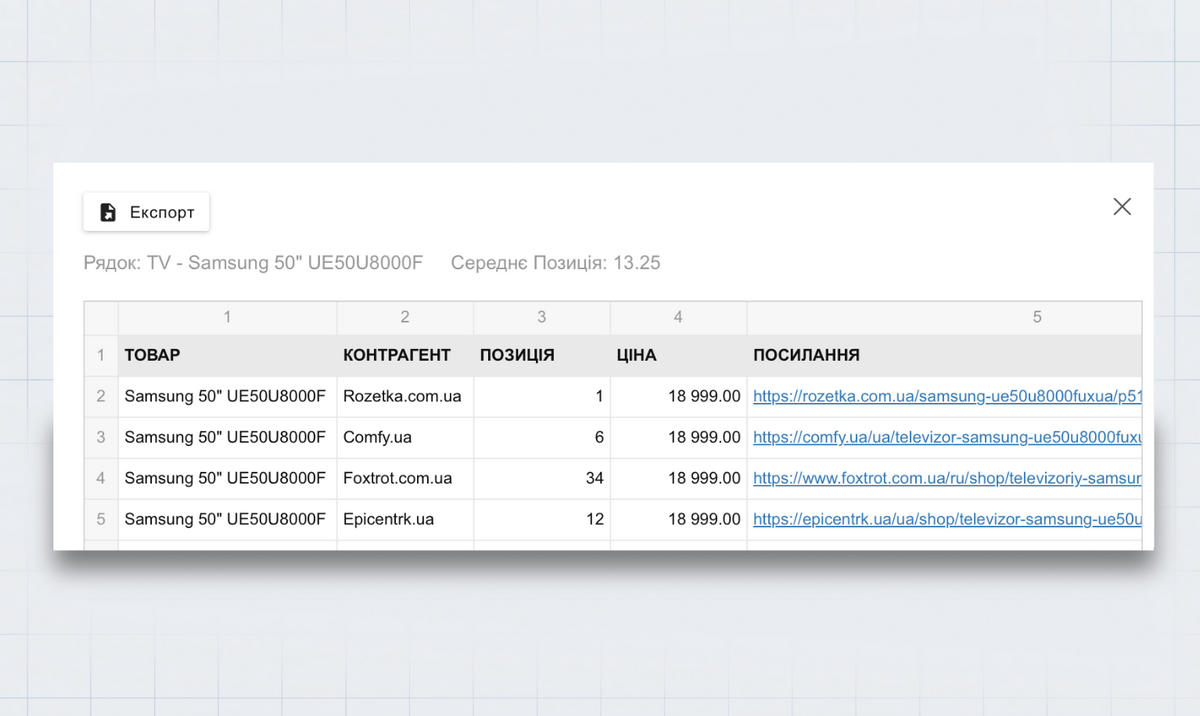 Можемо «провалитися» далі — на рівень конкретного товару, і подивитися, які позиції він посідає в кожного конкурента: