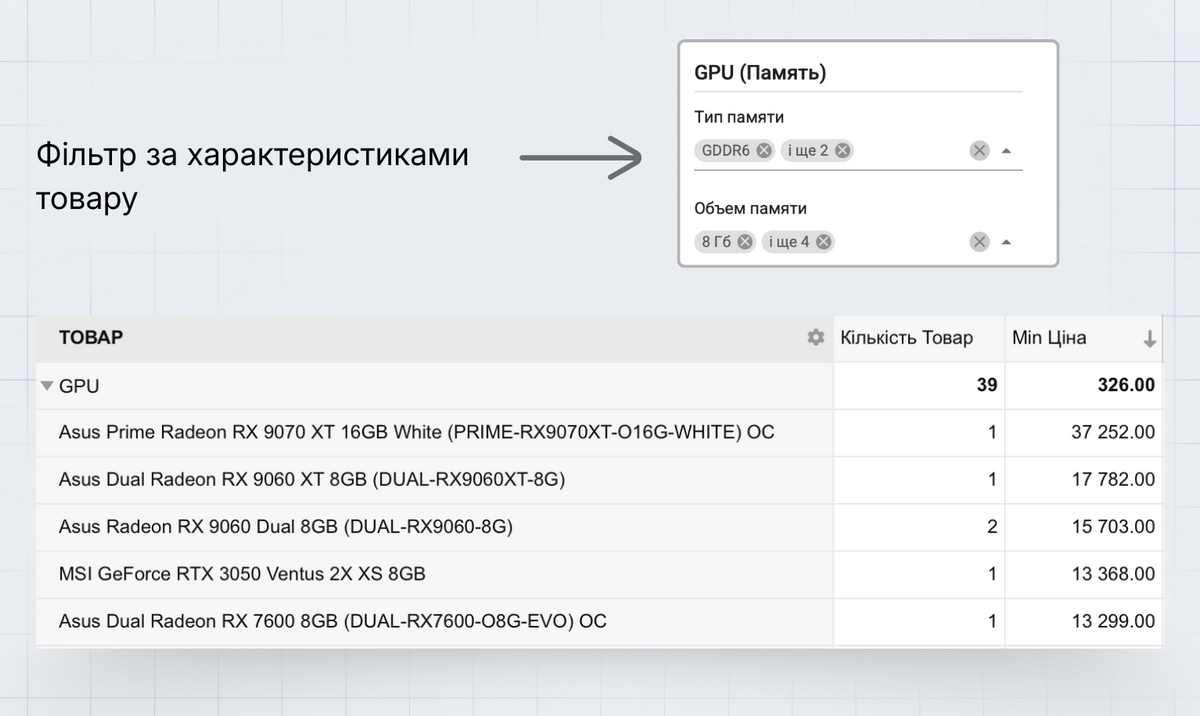 Це найбільш трудомісткий, але водночас точковий і дуже ефективний підхід. Ідея полягає в тому, що ви вже знаєте, товари з якими характеристиками найкраще продаються у вашій категорії. Тепер можна знайти всі товари конкурентів з подібними характеристиками й виявити, чого бракує у вашому каталозі.