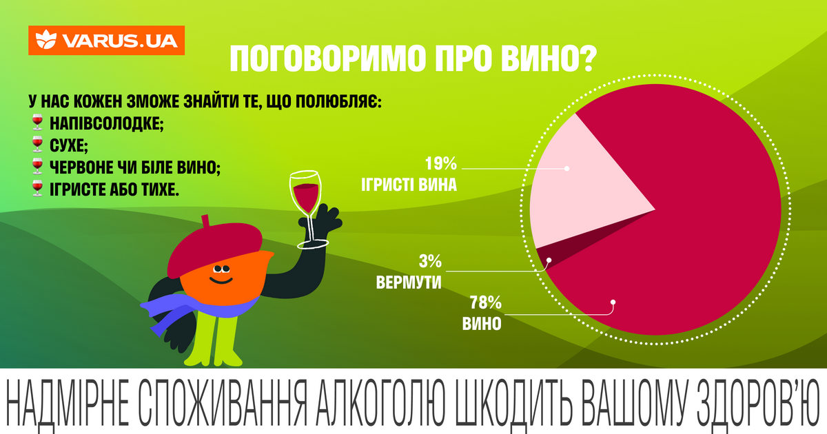 Клієнти varus.ua замовляють вина з різних куточків світу: від ігристих до тихих сортів. Традиційне вино безумовно займає найбільшу частку (78%) у цій категорії алкогольних напоїв, друге місце посідають ігристі вина – 19%, вермути займають 3% винного асортименту.