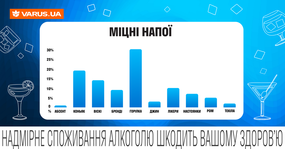 Серед найбільш популярних міцних напоїв на varus.ua є горілка – 30% та коньяк – 20%. Далі за популярністю можна виділити: віскі – 15%; лікери – 10%; бренді – 8%; настоянки – 6%; ром – 5%; джин – 3%; текіла – 2%; абсент – 1%.