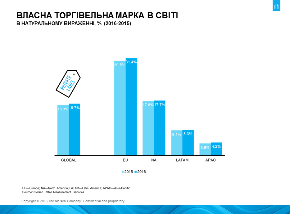 Схожа ситуація, де потенціал для розвитку приватних марок мереж великий, спостерігається в країнах Латинської Америки, Азії та в країнах Тихоокеанського регіону, де частка ВТМ становить менше 10%, за даними за 2016 рік.