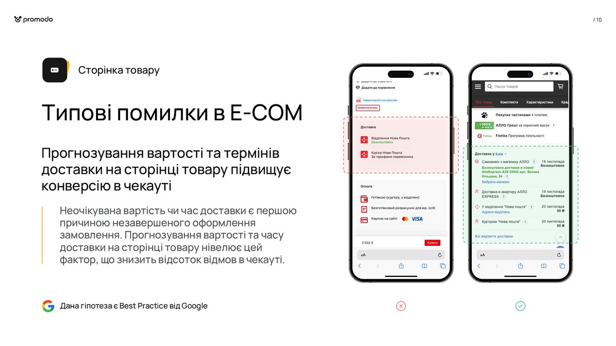 Буває, що неочікувана вартість доставки або її час стають причиною відмови від завершення процесу шопінгу. Нині (і це вже тренд) користувачу мало розуміти, коли буде відправлено товар. Він хоче знати час отримання і вартість. Згідно з дослідженням, проведеним у 2025 році, користувачі, які не побачили цю інформацію на сторінці товару, очікують знайти її в check out. Відсутність цих даних в обох точках шляху до завершення покупки призводить до відмови від замовлення.