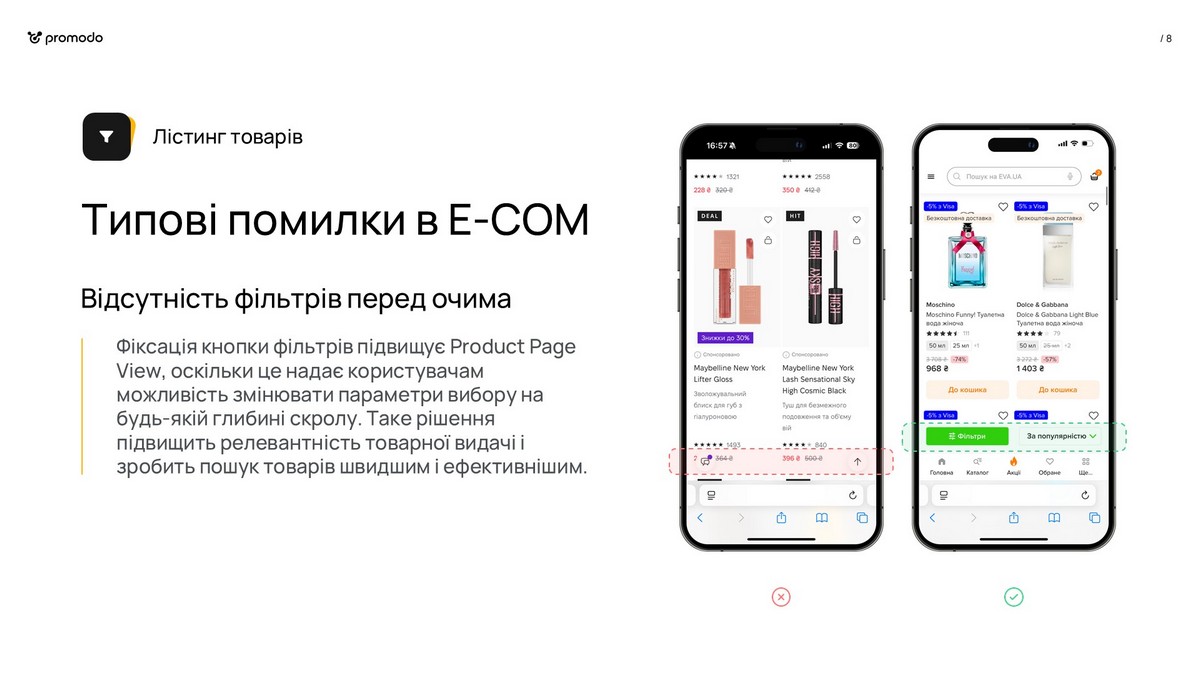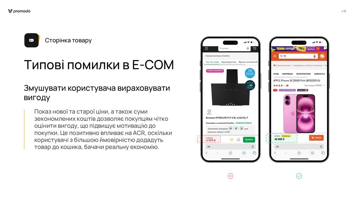 Одна з найбільших помилок – змушувати користувача рахувати. Якщо ритейлер проводить акцію чи оголошує знижки, потенційному покупцю мало показати стару й нову ціну. Він хоче одразу бачити, скільки зекономить.
