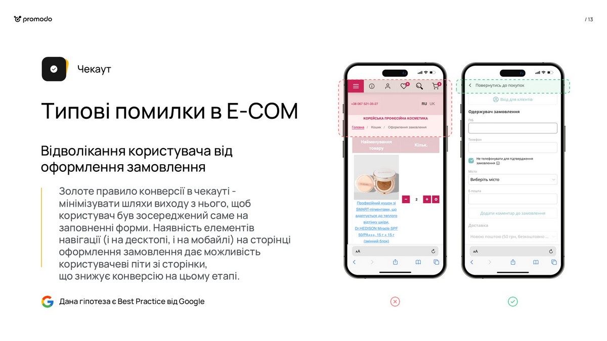 На останньому етапі варто концентрувати увагу користувача безпосередньо на оформлені замовлення. Щоб він не відволікся і не перервав конверсійний шлях (а якщо це новий користувач, він може закрити вкладку і більше ніколи не повернутися). Тут ключова задача – прибрати будь-які відволікаючі фактори.