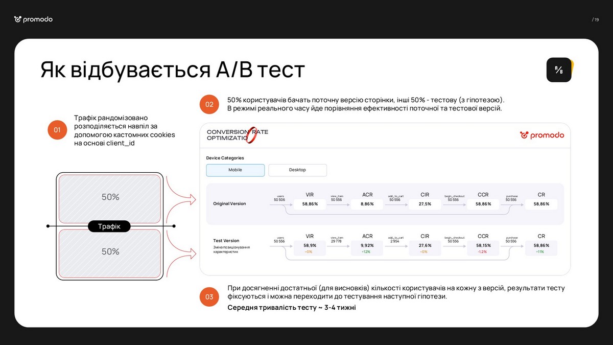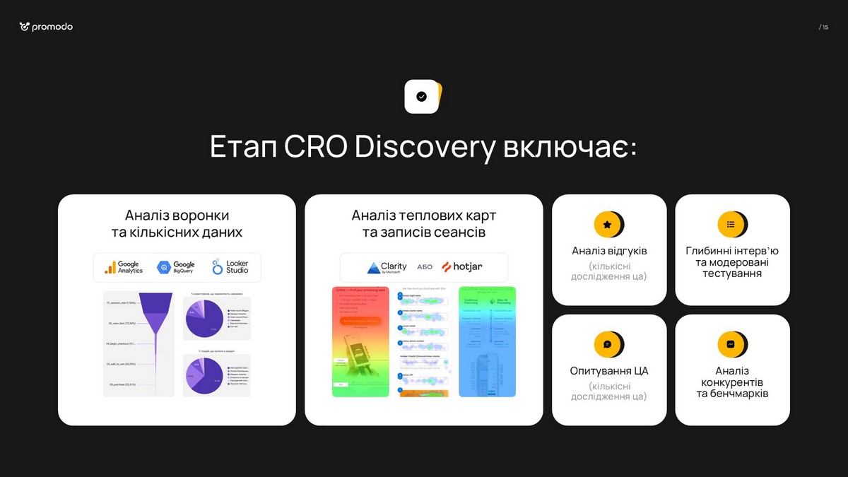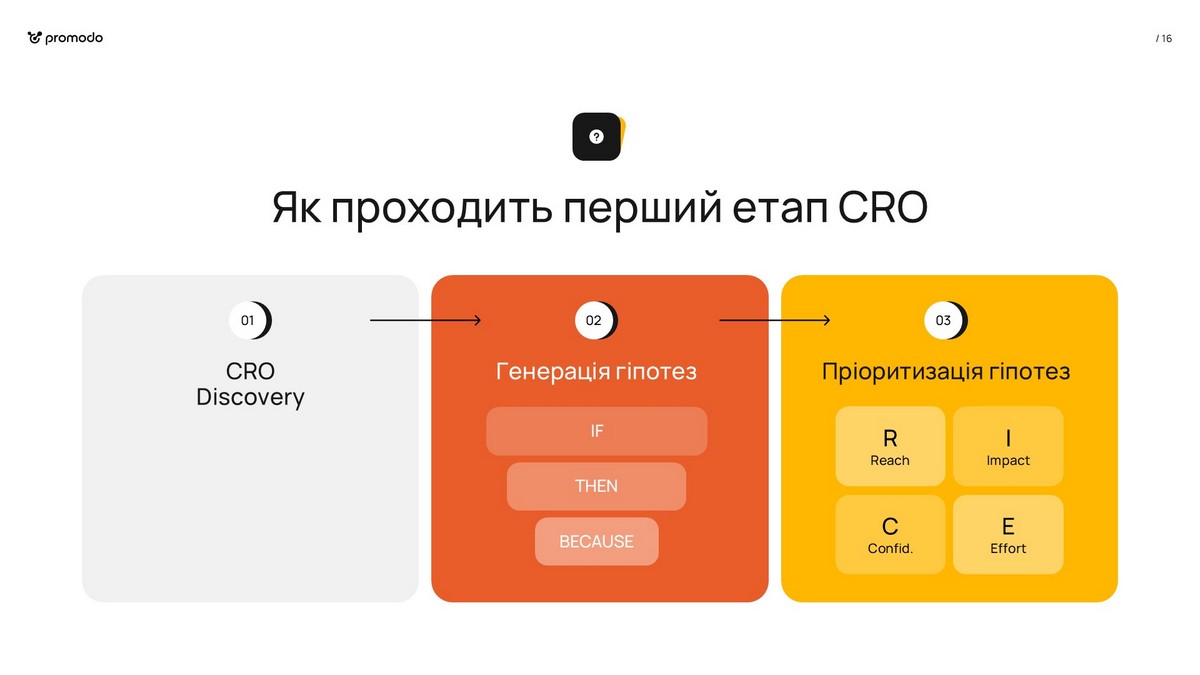Процес підвищення конверсії складається з трьох етапів. Це великі дослідження кількісних та якісних даних, дослідження цільової аудиторії, конкурентів, тощо.