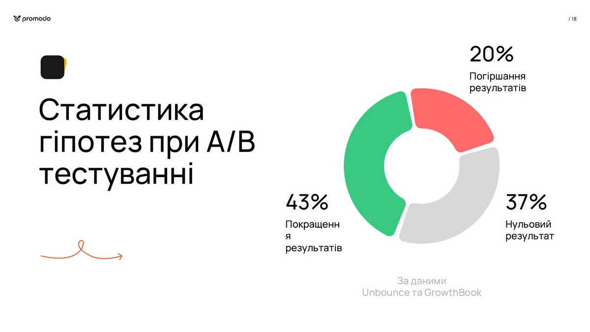 Тобто важливе охоплення гіпотези, її вплив, а також ступінь довіри до гіпотези і чи можна її сміливо впроваджувати чи ні. Але перш за все гіпотези треба валідувати, бо гіпотези – це не аксіоми. Кожен раз, коли висувається певна ідея щось покращити, є шанс, що вона не спрацює. Світова статистика свідчить, що приблизно 43% всіх висунутих гіпотез дають позитивний результат.