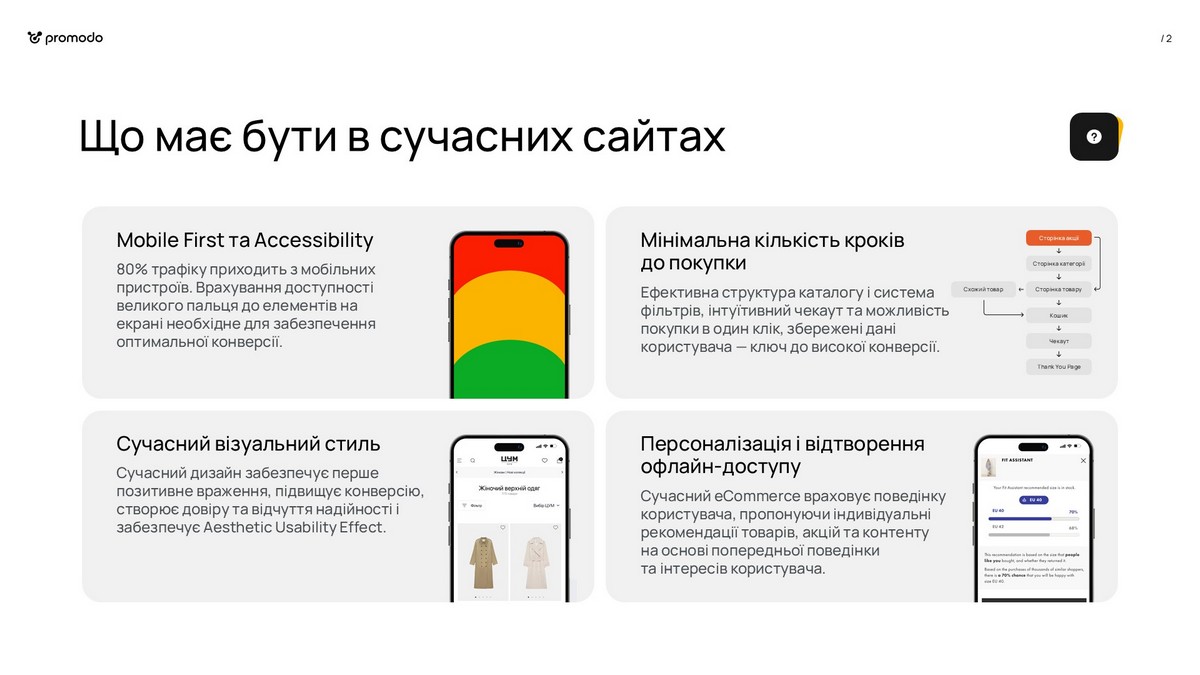Зрозуміло, що сучасний дизайн забезпечує перше позитивне враження і підвищує конверсію. Тобто, якщо сайт застарілий, відповідно, виникає питання у цільової аудиторії до продукту, який купується.