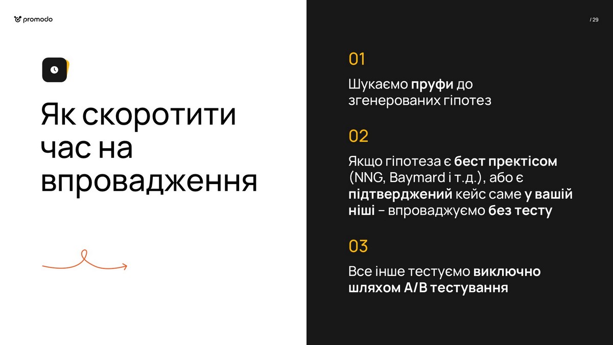 Аби пришвидшити цей процес можна до кожної гіпотези шукати докази, що вона працює. Це можуть бути кращі практики великих світових компаній, або якийсь кейс у певній ніші, коли хтось вже протестував цю гіпотезу і вона дала позитивний результат. Такі гіпотези з певною обережністю можна впроваджувати без тесту.