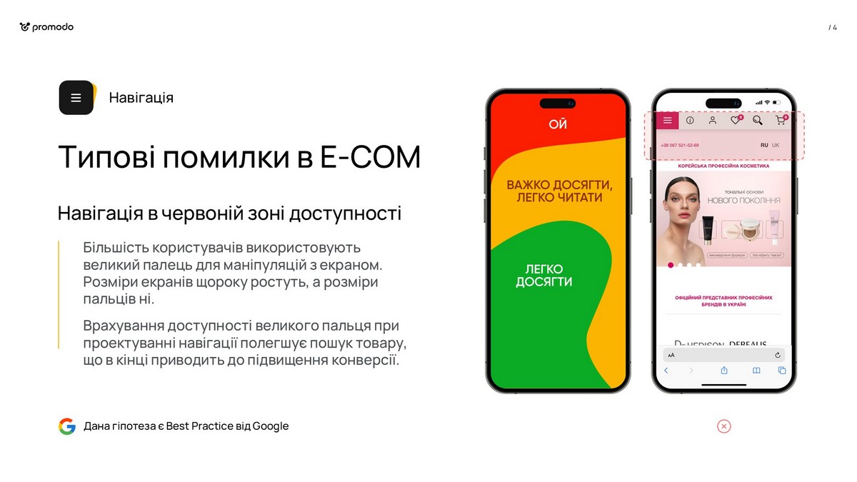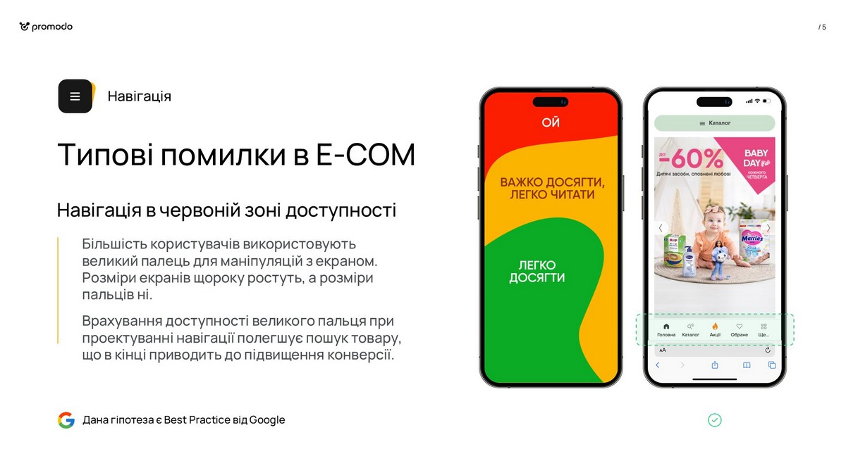 Однією з типових помилок при створенні мобільної версії сайту є розміщення меню навігації без урахування особливостей сучасного використання мобільних телефонів. Зараз більшість користувачів управляють телефоном однією рукою, тримаючи в іншій каву, пляшку води чи сумку. Відповідно частина екрану, куди важко дістатися великим пальцем перетворюється на «червону зону доступності». Тому всі конверсійні елементи управління мають бути в цій зеленій зоні.