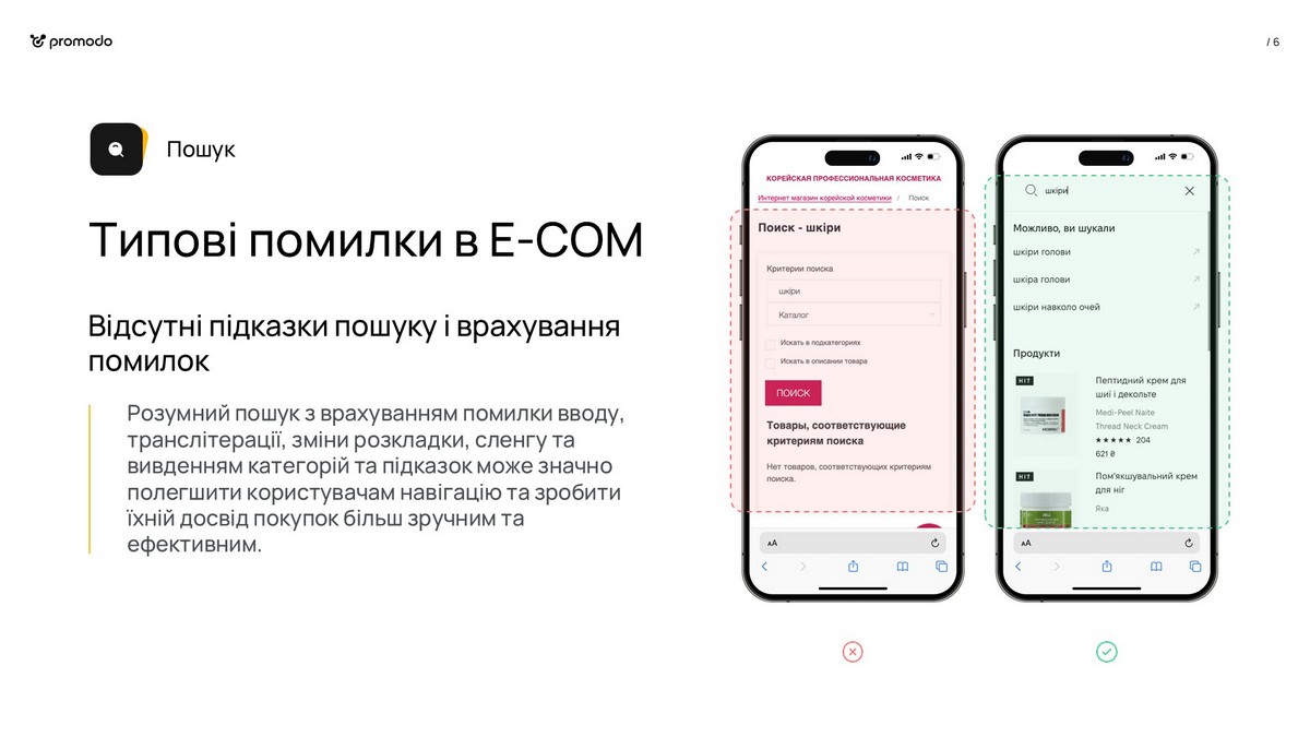 Іноді користувачам буває складно знайти щось на сайті, зокрема через помилки при наборі тексту запиту. В результаті вони отримують відповідь про відсутність такого товару в магазині. І хоча достатньо складно зробити такий розумний пошук на сайті (з підказками можливих варіантів), це варто робити.