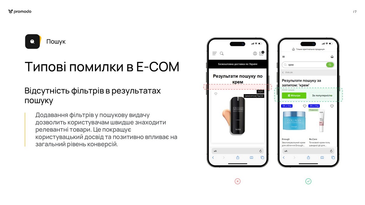 Ще одна проблема, пов’язана з пошуком товарів на сайті, стосується зручності роботи з уже отриманими результатами. Якщо не можна відфільтрувати товари за певними критеріями вірогідність знайти потрібну річ значно падає. Відповідно, додавання елементу фільтрування результатів пошуку дуже важливо, щоб людина таки перейшла на сторінку товару.