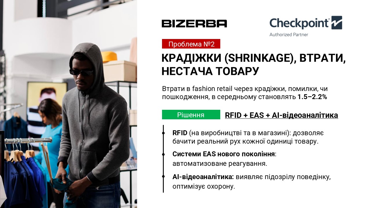 Втрати в fashion ритейлі через крадіжки, помилки чи пошкодження в середньому становлять 1,5-2,2%. Рішення: RFID + EAS + АI-відеоаналітика.