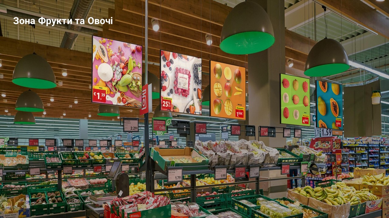 82% рішень відбувається в місцях продажу товару, тож ритейл медіа впливає на зростання конверсії в магазині. Ось приклади екранів, які можуть розміщуватися в будь-якому куточку магазину.